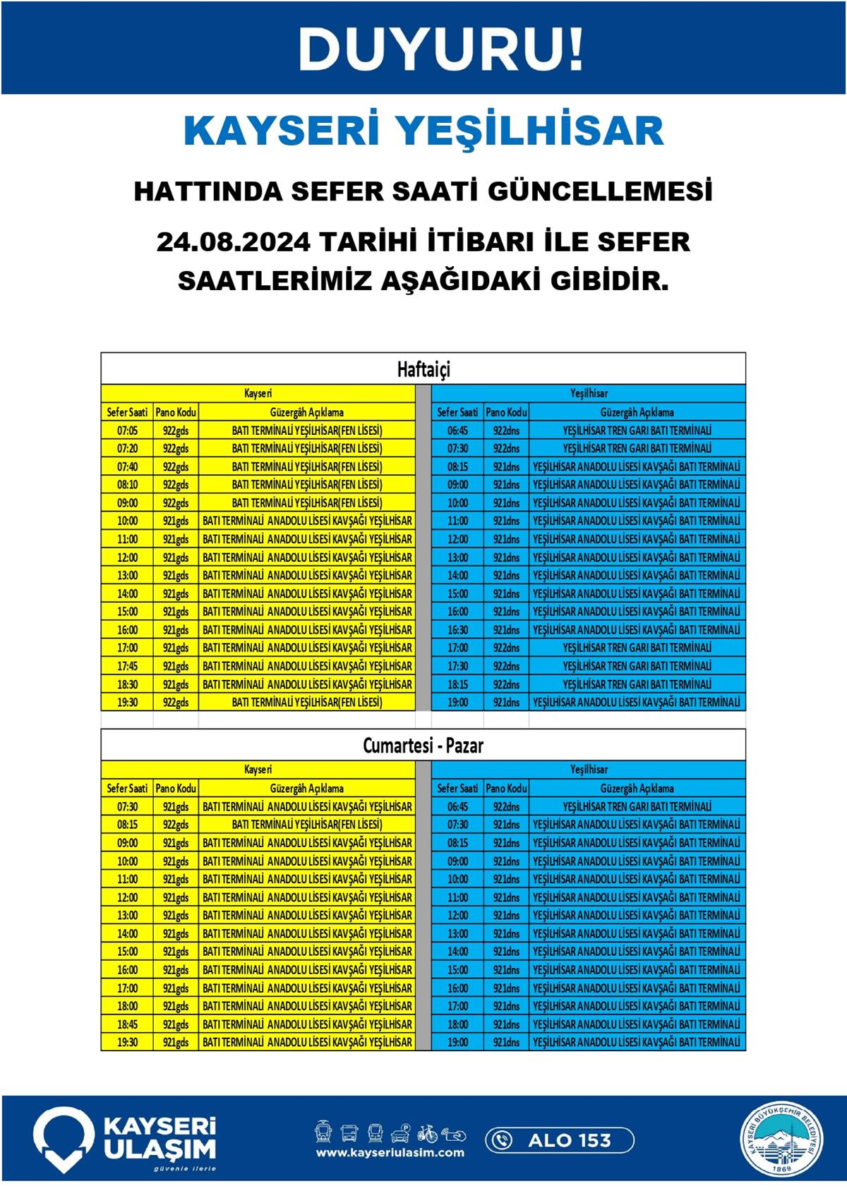 KAYSERİ YEŞİLHİSAR HATTINDA SEFER SAATİ GÜNCELLEMESİ