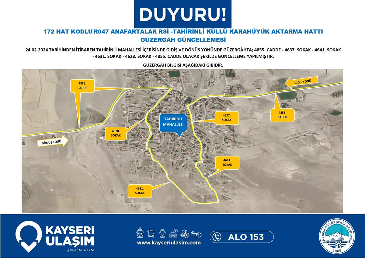 ANAFARTALAR RSİ -TAHİRİNLİ KÜLLÜ KARAHÜYÜK AKTARMA HATTI GÜZERGÂH GÜNCELLEMESİ 24 Şubat 2024 tarihinden itibariyle güzergah güncellemesi yapılmıştır.