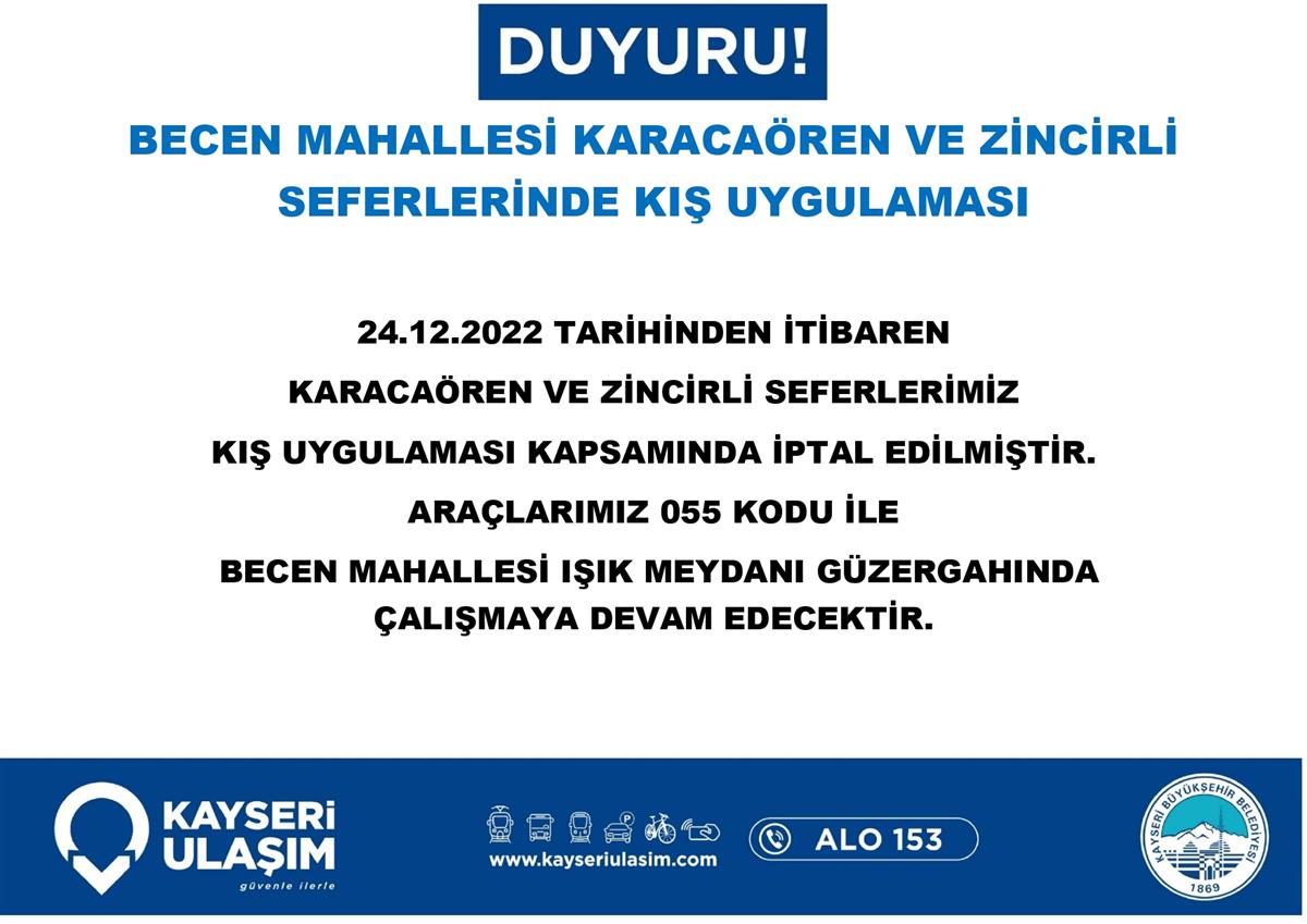 3 Karacaören Ve Zincirli seferlerimiz kış uygulaması kapsamında iptal edilmiştir. Araçlarımız 055 Kodu ile Becen Mahallesi Işık Meydanı Güzergahında Çalışmaya Devam Edecektir.