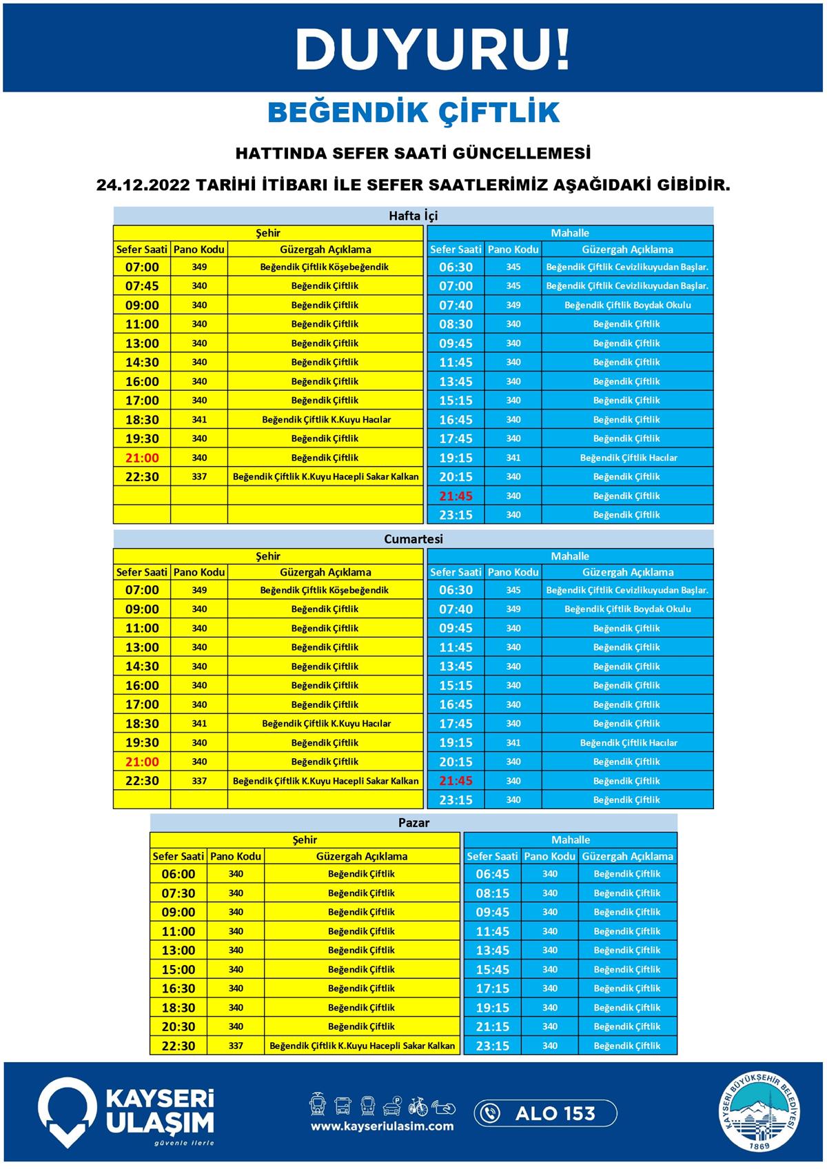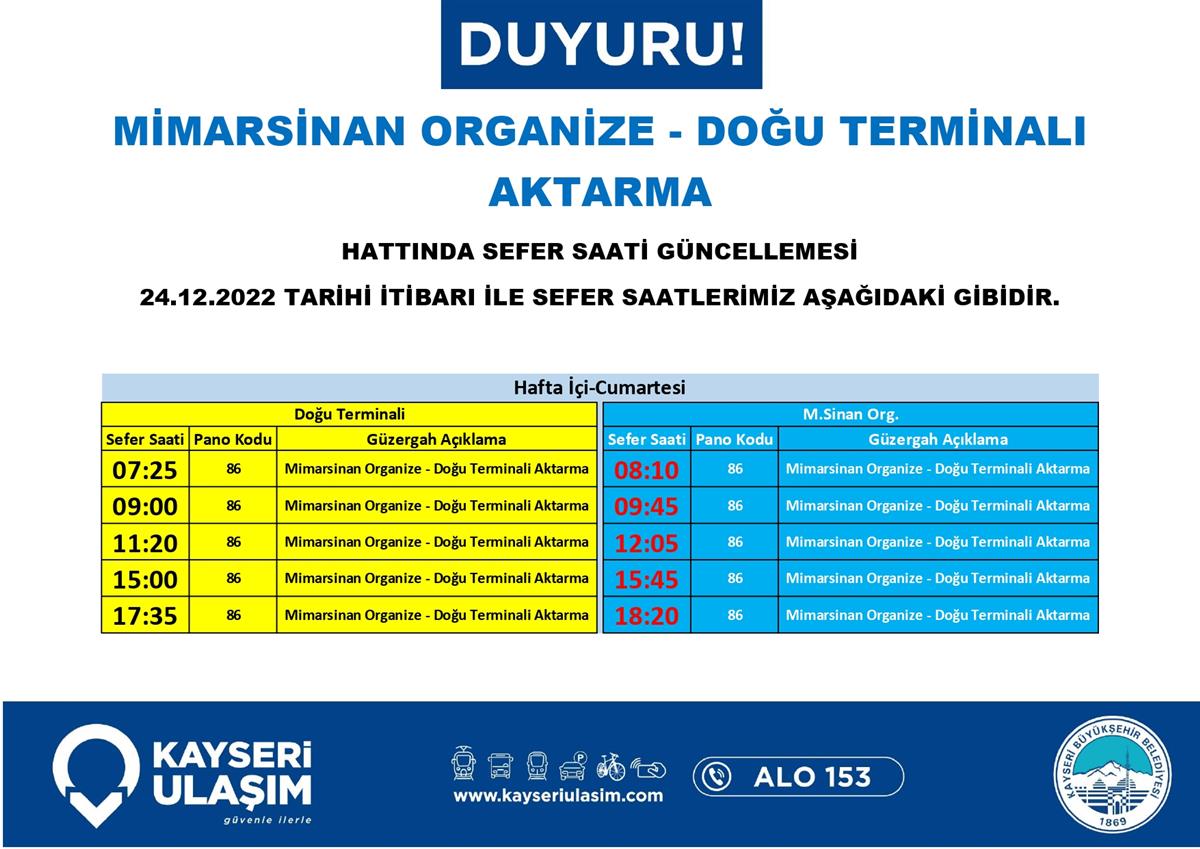 2 24.12.2022 tarihi itibariyle; Mimarsinan Organize - Doğu Terminali Aktarma ve Beğendik Çiftlik Hattında sefer saati güncellemesi yapılmıştır.