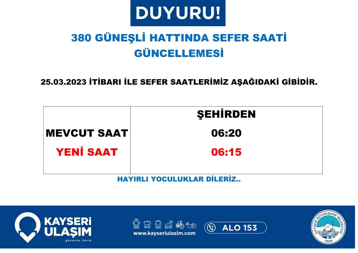 380 GÜNEŞLİ HATTINDA SEFER SAATİ GÜNCELLEMESİ