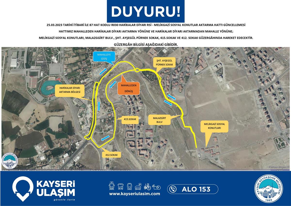 25.03.2023 TARİHİ İTİBARİ İLE 87 HAT KODLU R030 HARİKALAR DİYARI RSİ - MELİKGAZİ SOSYAL KONUTLAR AKTARMA HATTI GÜNCELLEMESİ