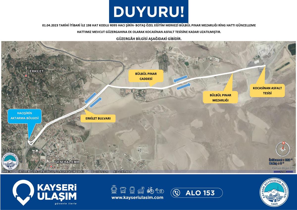 01.04.2023 TARİHİ İTİBARİ İLE 198 HAT KODLU R095 HACI ŞİRİN- BOTAŞ ÖZEL EĞİTİM MERKEZİ BÜLBÜL PINAR MEZARLIĞI RİNG HATTI GÜNCELLEME HATTIMIZ MEVCUT GÜZERGAHINA EK OLARAK KOCASİNAN ASFALT TESİSİNE KADAR UZATILMIŞTIR. GÜZERGÂH BİLGİSİ AŞAĞIDAKİ GİBİDİR.