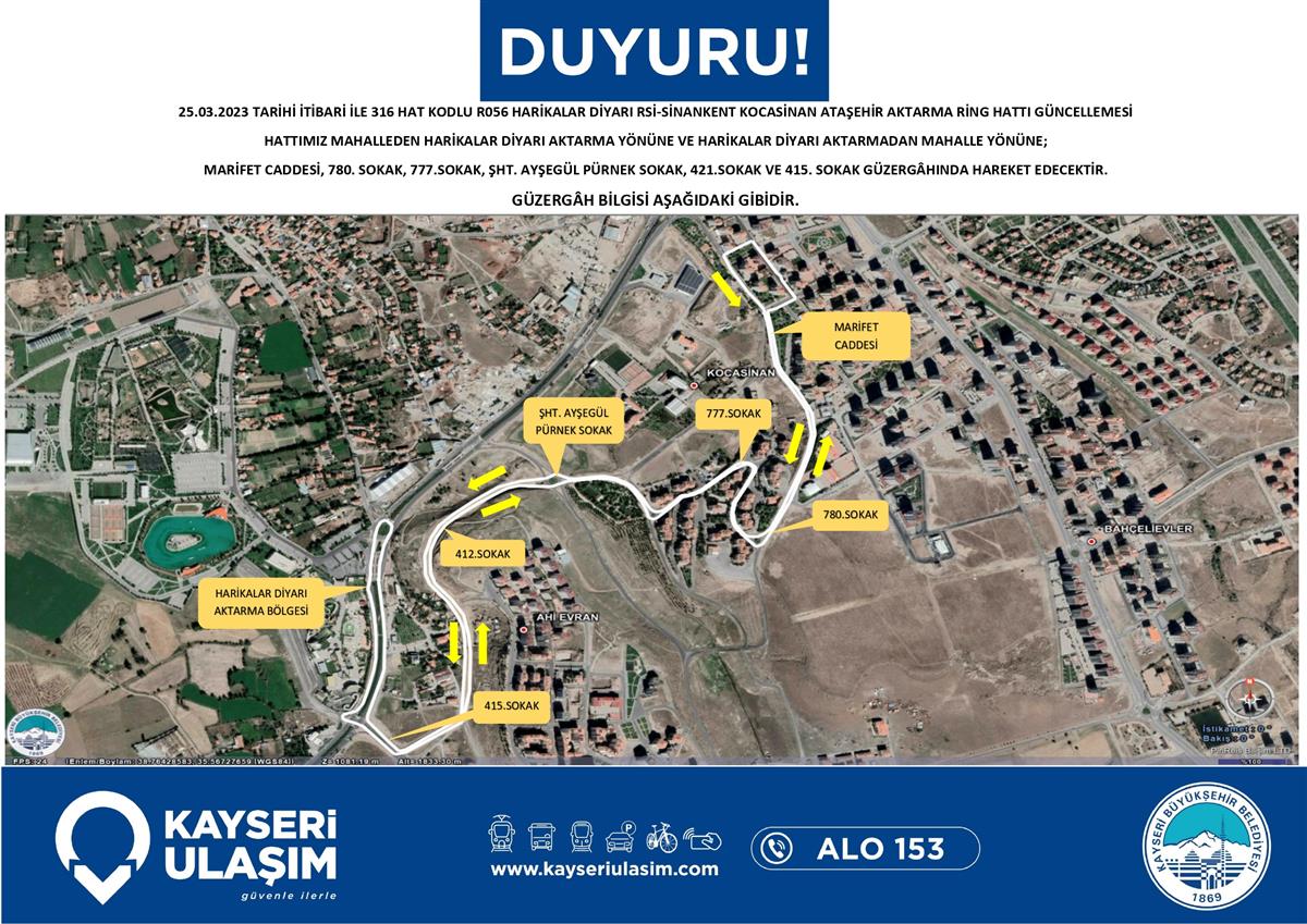 25.03.2023 TARİHİ İTİBARİ İLE 316 HAT KODLU R056 HARİKALAR DİYARI RSİ-SİNANKENT KOCASİNAN ATAŞEHİR AKTARMA RİNG HATTI GÜNCELLEMESİ
