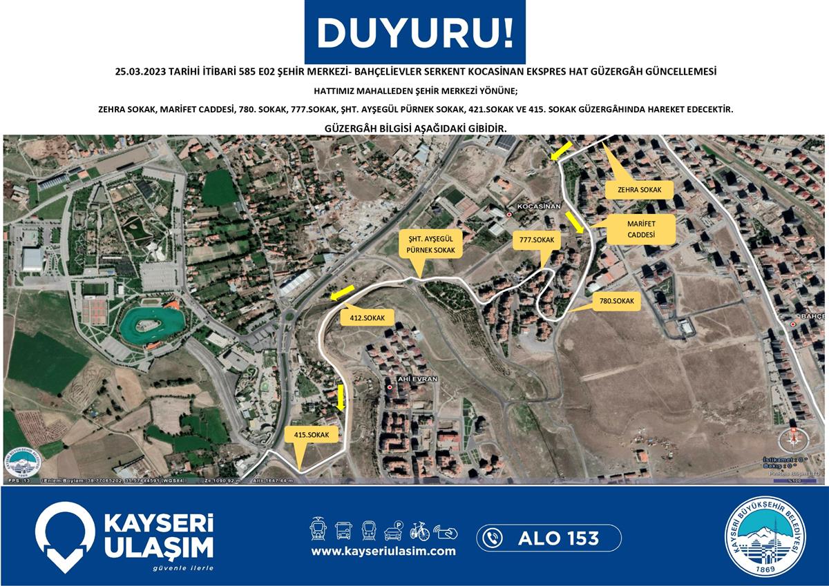 25.03.2023 TARİHİ İTİBARİ 585 E02 ŞEHİR MERKEZİ- BAHÇELİEVLER SERKENT KOCASİNAN EKSPRES HAT GÜZERGÂH GÜNCELLEMESİ