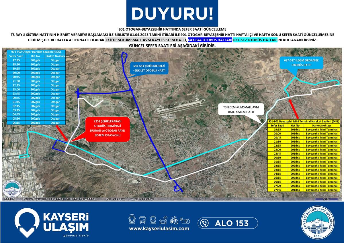 T3 RAYLI SİSTEM HATTININ HİZMET VERMEYE BAŞLAMASI İLE BİRLİKTE 01.04.2023 TARİHİ İTİBARİ İLE 901 OTOGAR-BEYAZŞEHİR HATTI HAFTA İÇİ VE HAFTA SONU SEFER SAATİ GÜNCELLEMESİNE GİDİLMİŞTİR. BU HATTA ALTERNATİF OLARAK T3 İLDEM-KUMSMALL AVM RAYLI SİSTEM HATTI, 643-644 OTOBÜS HATLARI,627-517 OTOBÜS HATLARI NI KULLANABİLİRSİNİZ. GÜNCEL SEFER SAATLERİ AŞAĞIDAKİ GİBİDİR.