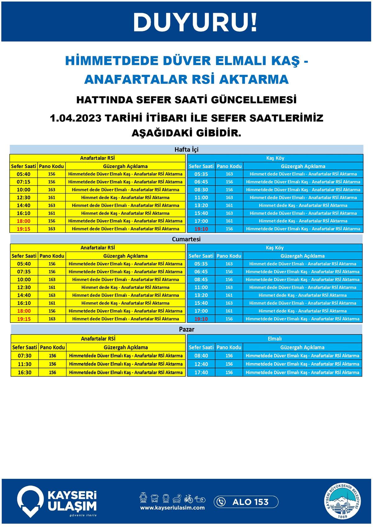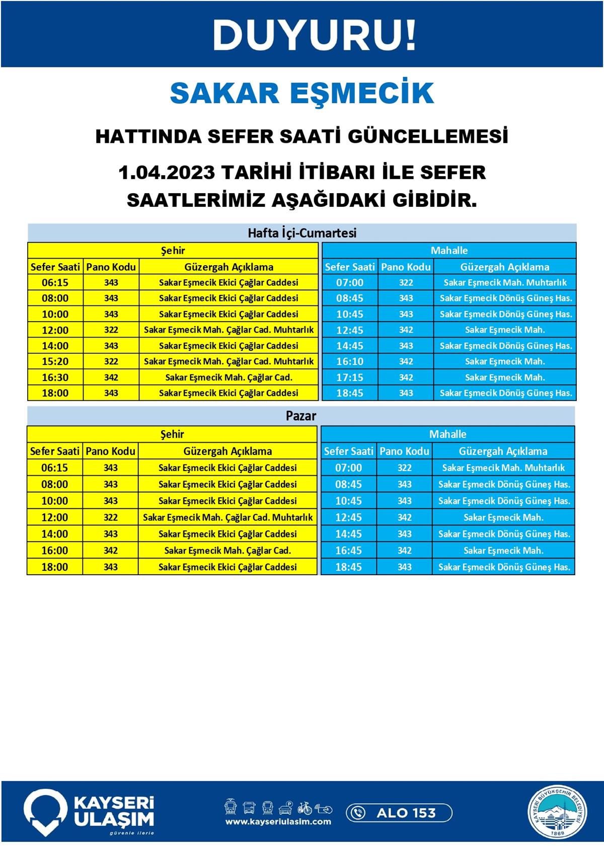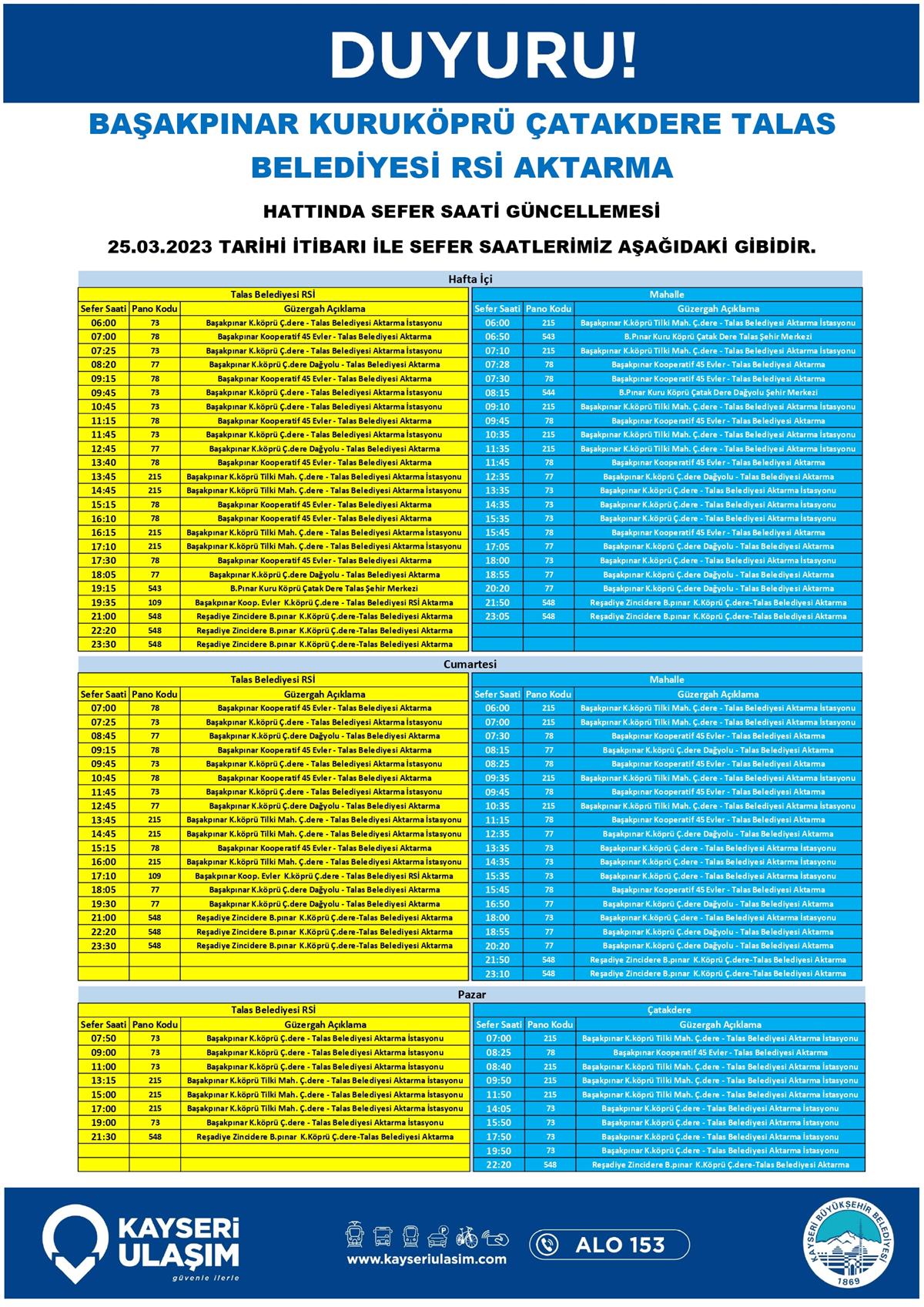 BAŞAKPINAR KURUKÖPRÜ ÇATAKDERE TALAS BELEDİYESİ RSİ AKTARMA HATTINDA SEFER SAATİ GÜNCELLEMESİ 25.03.2023 TARİHİ İTİBARI İLE SEFER SAATLERİMİZ AŞAĞIDAKİ GİBİDİR.