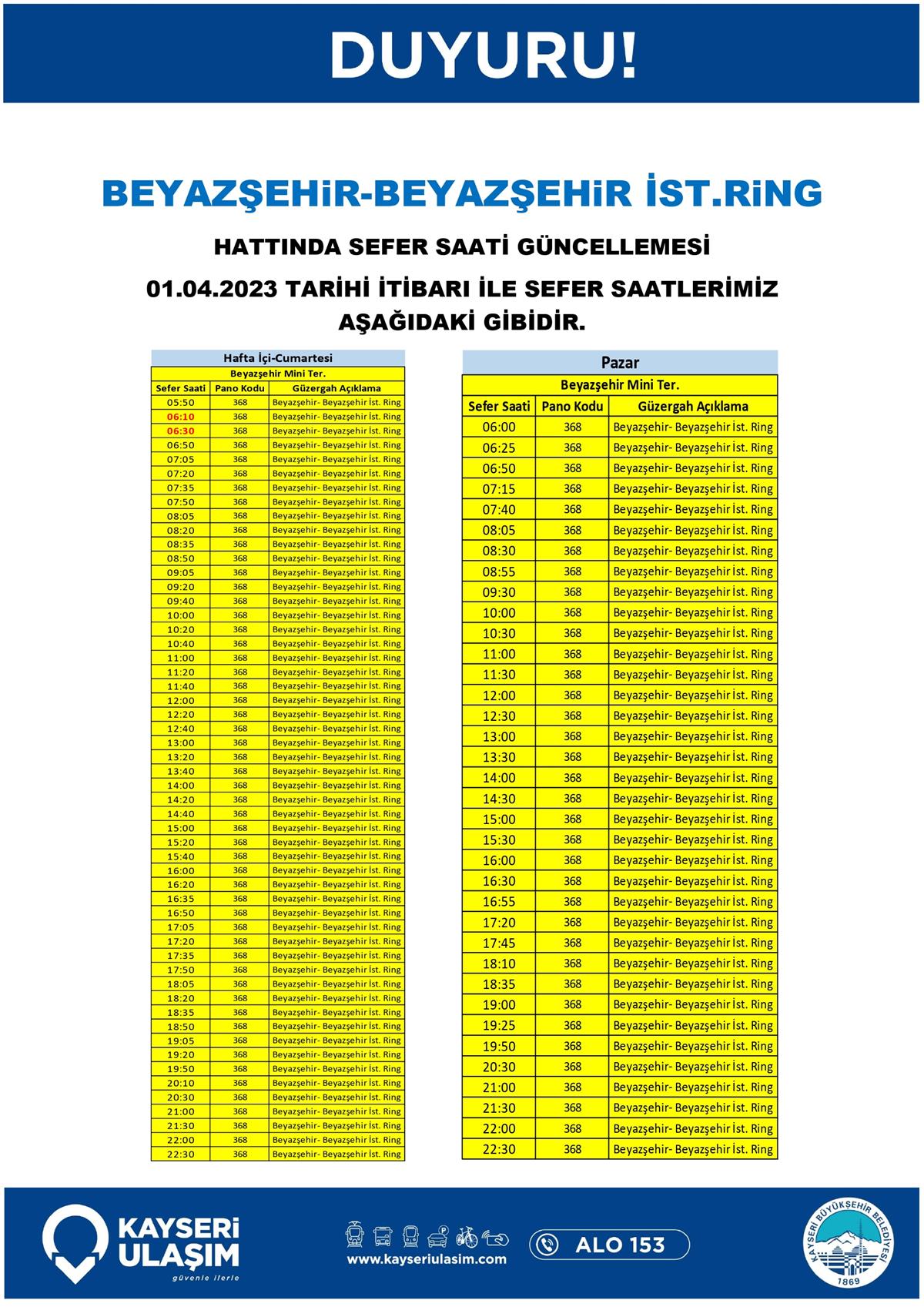 BEYAZŞEHiR-BEYAZŞEHiR İST.RiNG HATTINDA SEFER SAATİ GÜNCELLEMESİ 01.04.2023 TARİHİ İTİBARI İLE SEFER SAATLERİMİZ AŞAĞIDAKİ GİBİDİR.