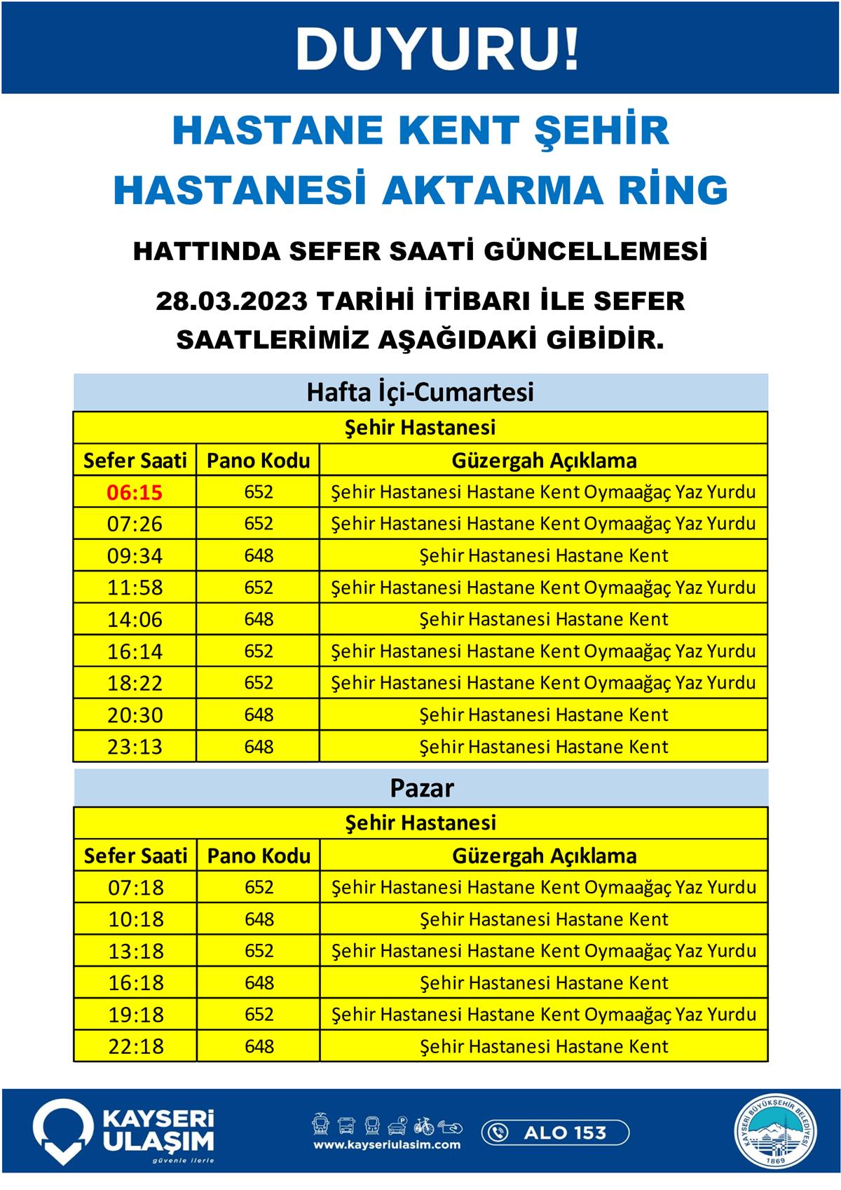 HASTANE KENT ŞEHİR HASTANESİ AKTARMA RİNG HATTINDA SEFER SAATİ GÜNCELLEMESİ 28.03.2023 TARİHİ İTİBARI İLE SEFER SAATLERİMİZ AŞAĞIDAKİ GİBİDİR.