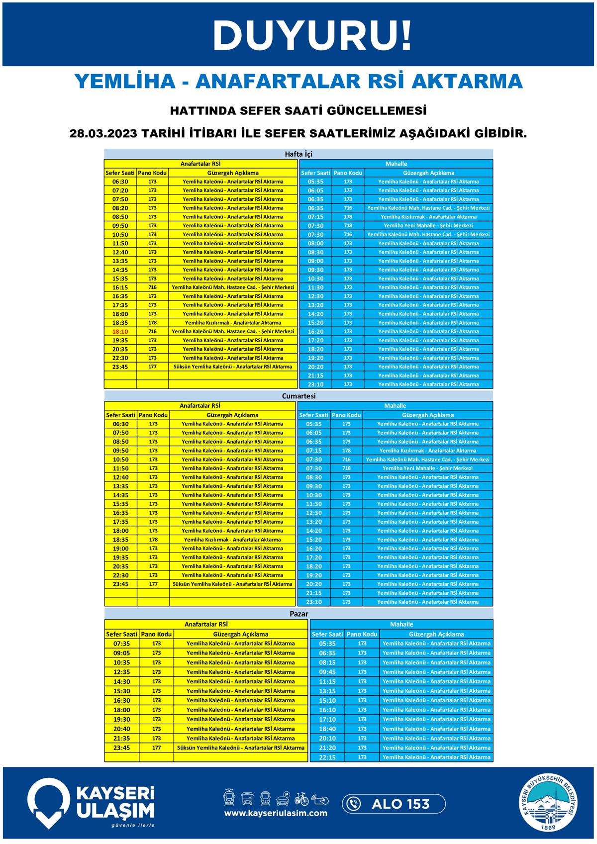 YEMLİHA - ANAFARTALAR RSİ AKTARMA HATTINDA SEFER SAATİ GÜNCELLEMESİ 28.03.2023 TARİHİ İTİBARI İLE SEFER SAATLERİMİZ AŞAĞIDAKİ GİBİDİR.