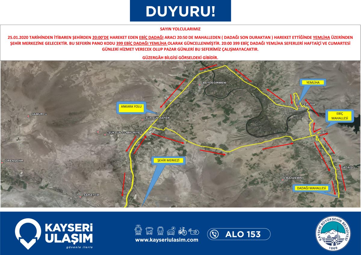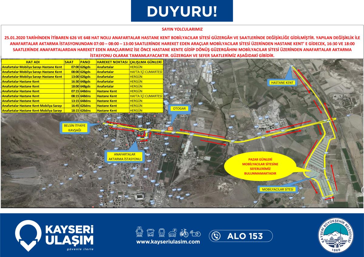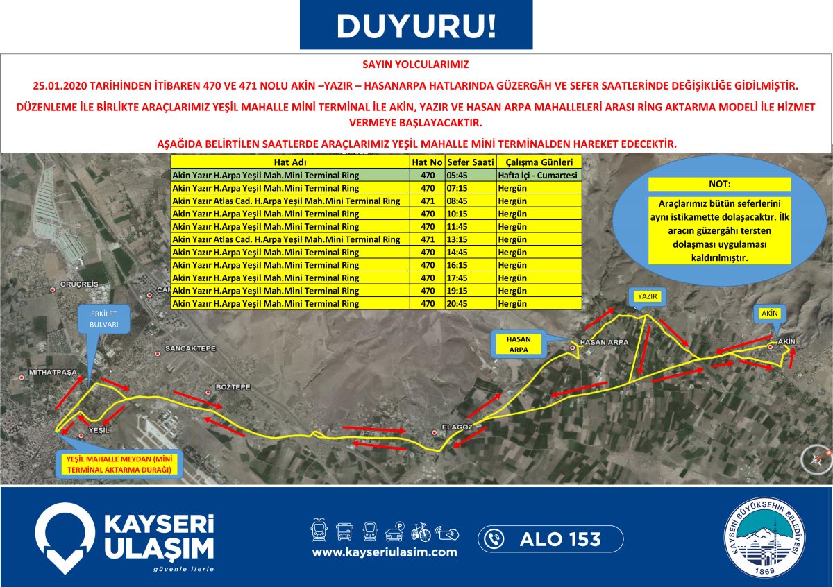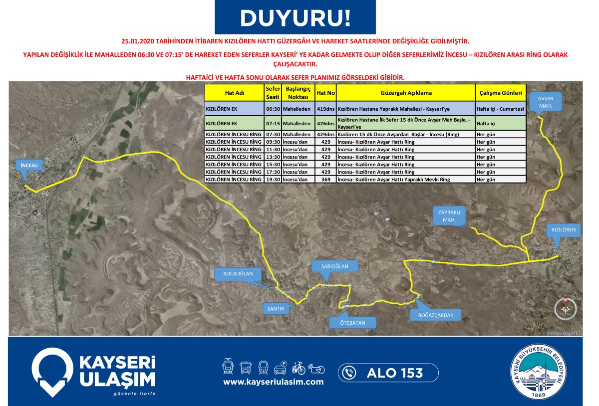 25.01.2020 Tarihinden itibaren geçerli olacak şekilde, Kızılören, Ebiç-Yemliha, Akin ve Hastanekent otobüs hatlarında değişiklik yapılmıştır. Detaylı bilgiye görsellerden ulaşabilirsiniz.