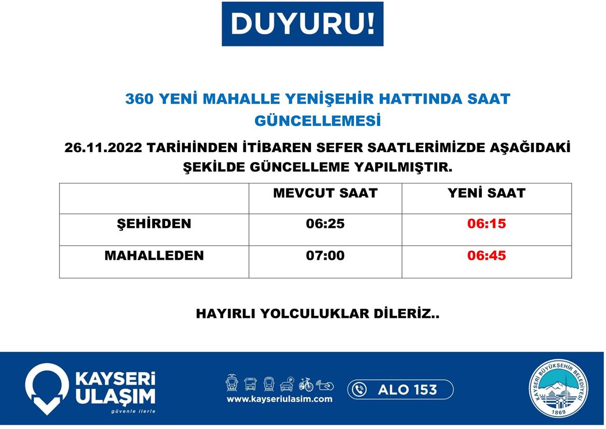 360 YENİ MAHALLE YENİŞEHİR HATTINDA SAAT GÜNCELLEMESİ 26.11.2022 Tarihinden itibaren saatlerimiz tablodaki gibidir.