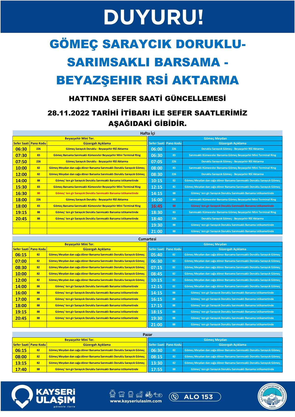 GÖMEÇ SARAYCIK DORUKLU-SARIMSAKLI BARSAMA-BEYAZŞEHİR RSİ AKTARMA Hattında sefer saati güncellemesi 28.11.2022 tarihi itibari ile sefer saatlerimiz tablodaki gibidir.