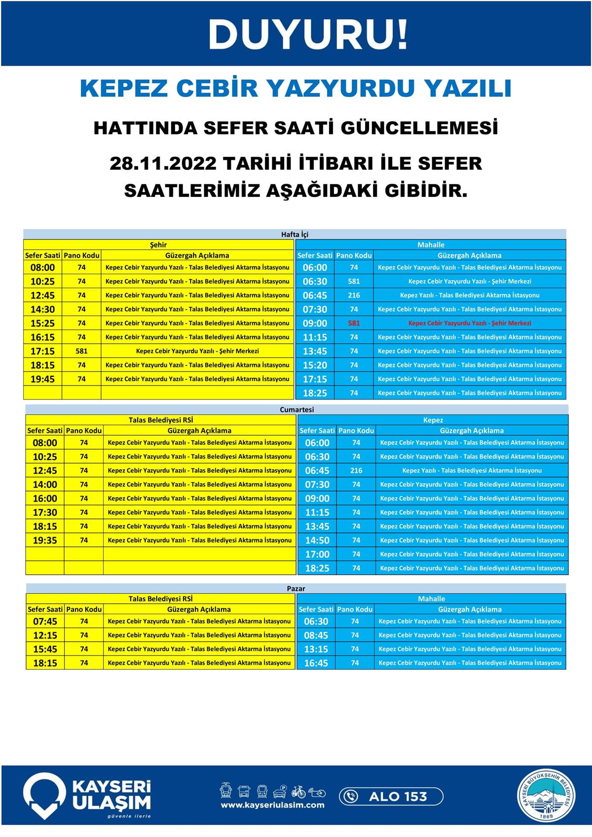 KEPEZ CEBİR YAZYURDU YAZILI Hattında sefer saati güncellemesi 28.11.2022 tarihi itibari ile sefer saatlerimiz tablodaki gibidir.