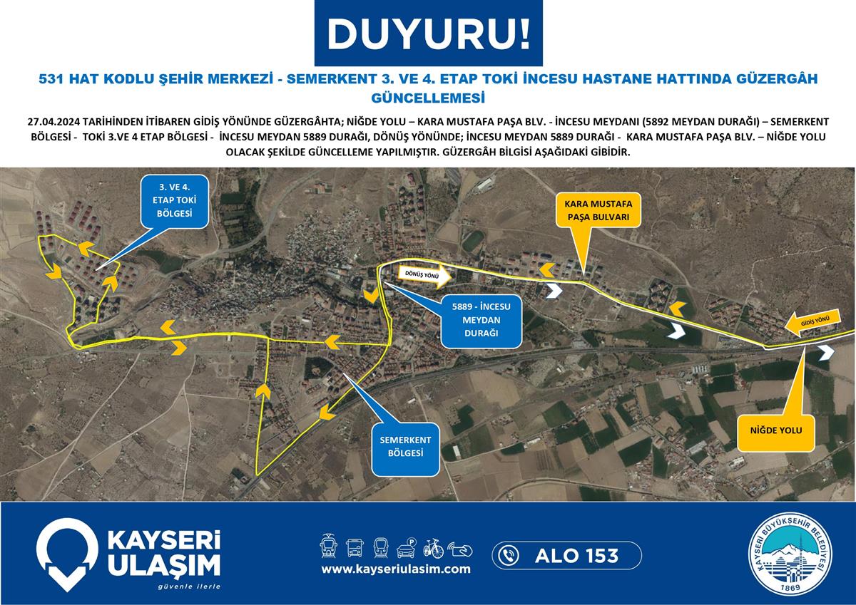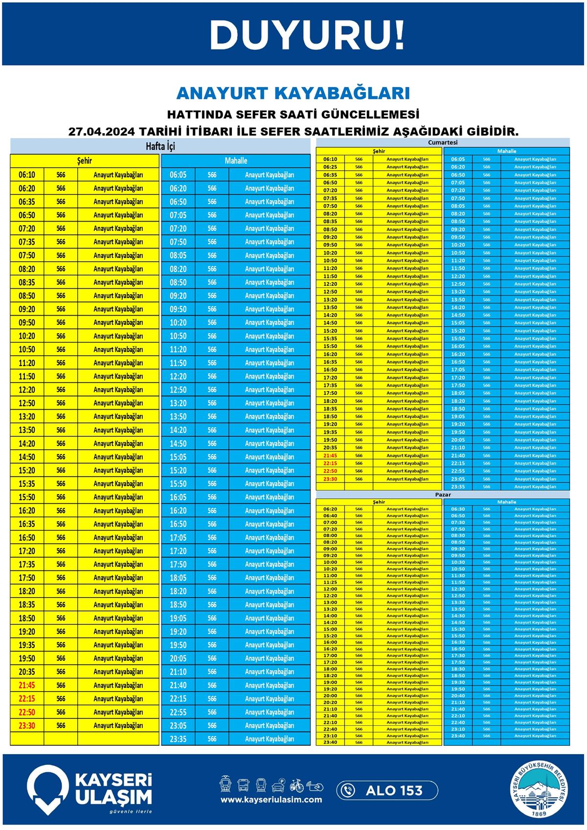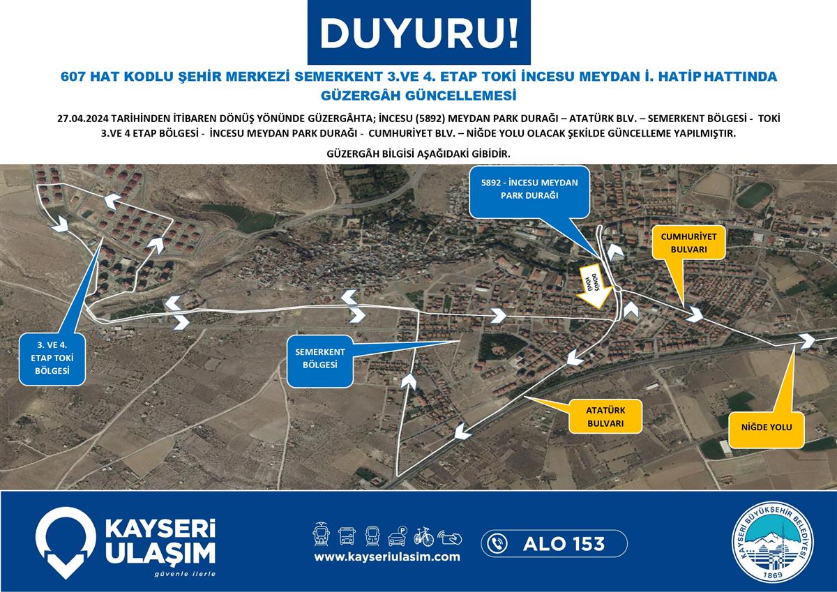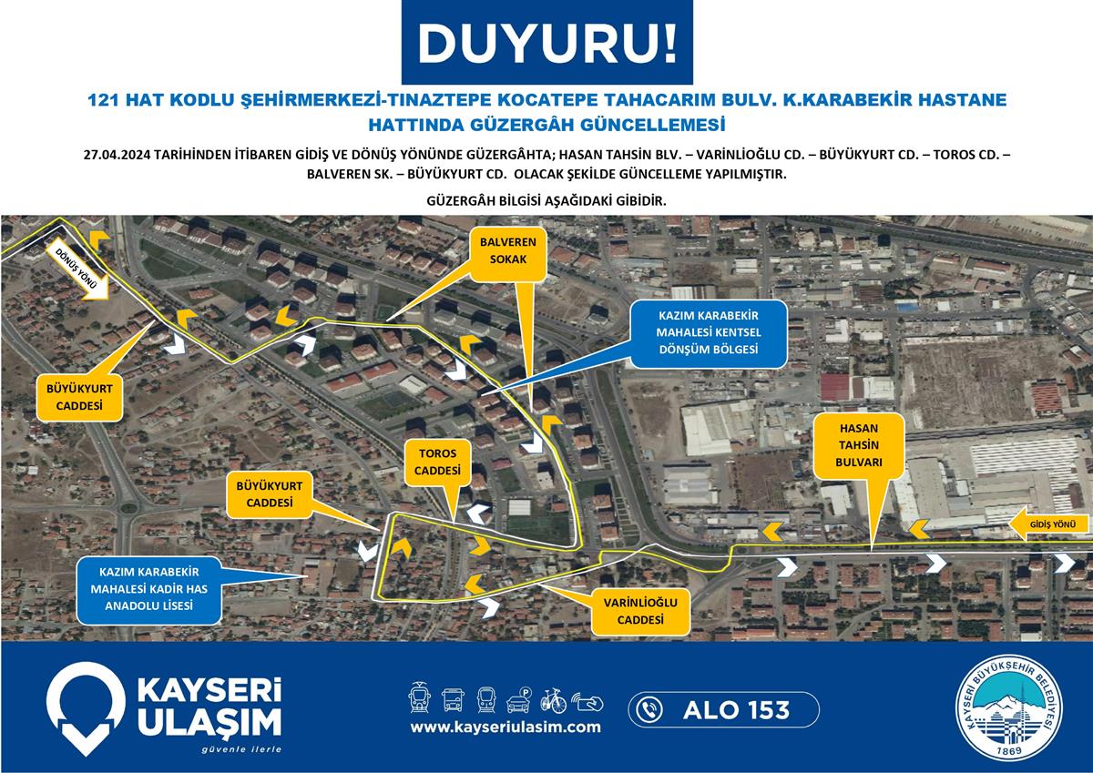 ŞEHİRMERKEZİ-TINAZTEPE KOCATEPE TAHACARIM BULV. K.KARABEKİR HASTANE HATTINDA GÜZERGÂH GÜNCELLEMESİ ŞEHİR MERKEZİ - SEMERKENT 3. VE 4. ETAP TOKİ İNCESU HASTANE HATTINDA GÜZERGÂH GÜNCELLEMESİ ŞEHİR MERKEZİ SEMERKENT 3.VE 4. ETAP TOKİ İNCESU MEYDAN İ. HATİP HATTINDA GÜZERGÂH GÜNCELLEMESİ ANAYURT KAYABAĞLARI HATTINDA SEFER SAATİ GÜNCELLEMESİ ERKİLET HACI ŞİRİN ERKİLET YUKARI RİNG HATTINDA SEFER SAATİ GÜNCELLEMESİ YAVUZSELİM HARİKALAR DİYARI RİNG HATTINDA SEFER SAATİ GÜNCELLEMESİ 27-29 Nisan 2024 Tarihinden itibaren Bazı Sefer Saat ve Güzergah Güncellemeleri Yapılmıştır.