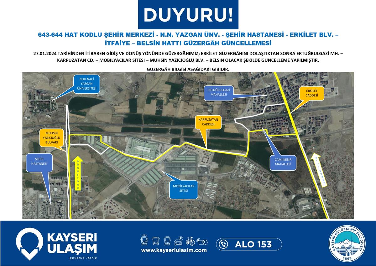ŞEHİR MERKEZİ - N.N. YAZGAN ÜNV. - ŞEHİR HASTANESİ - ERKİLET BLV. – İTFAİYE – BELSİN HATTI GÜZERGÂH GÜNCELLEMESİ