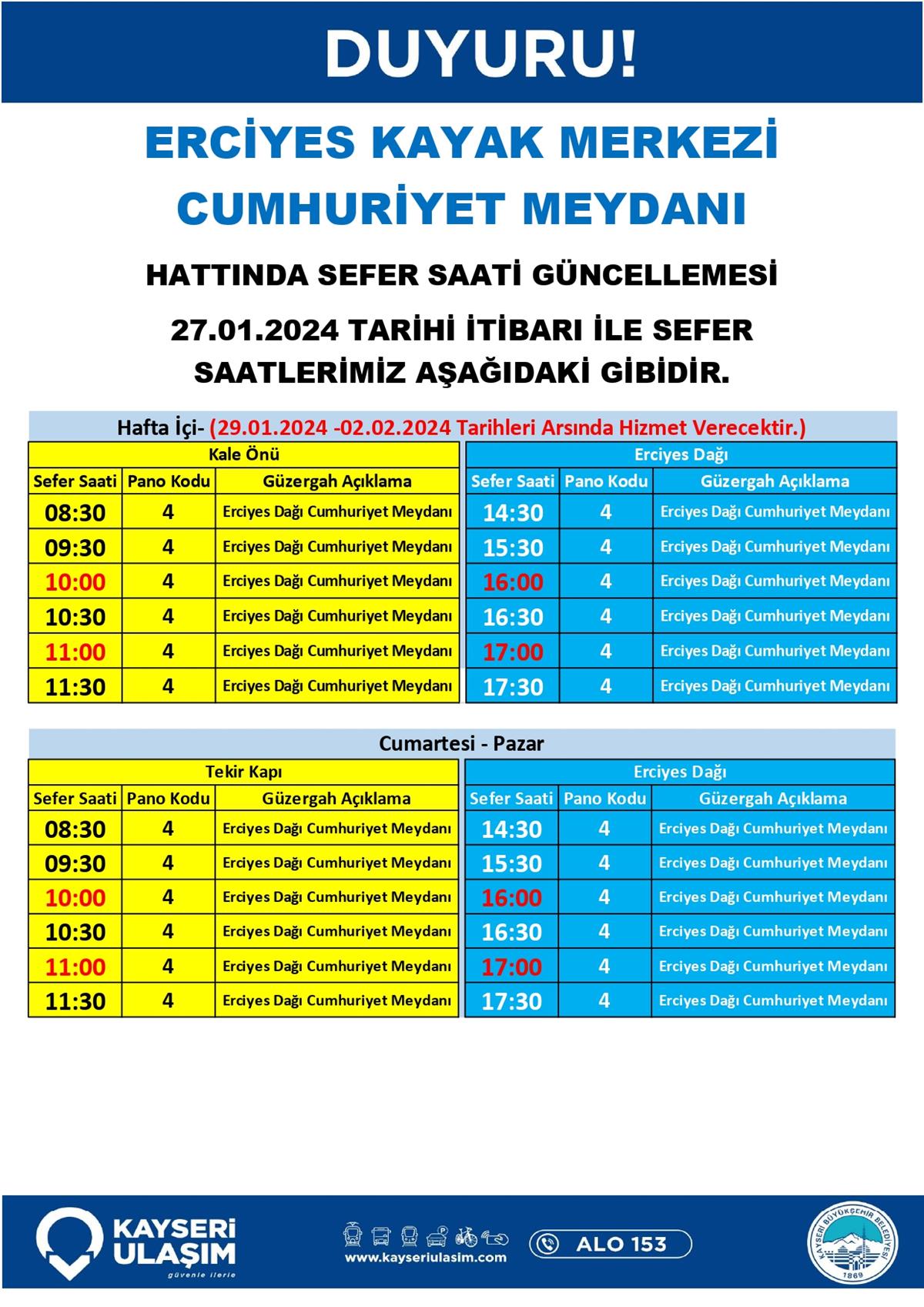 ERCİYES KAYAK MERKEZİ CUMHURİYET MEYDANI HATTINDA SEFER SAATİ GÜNCELLEMESİ