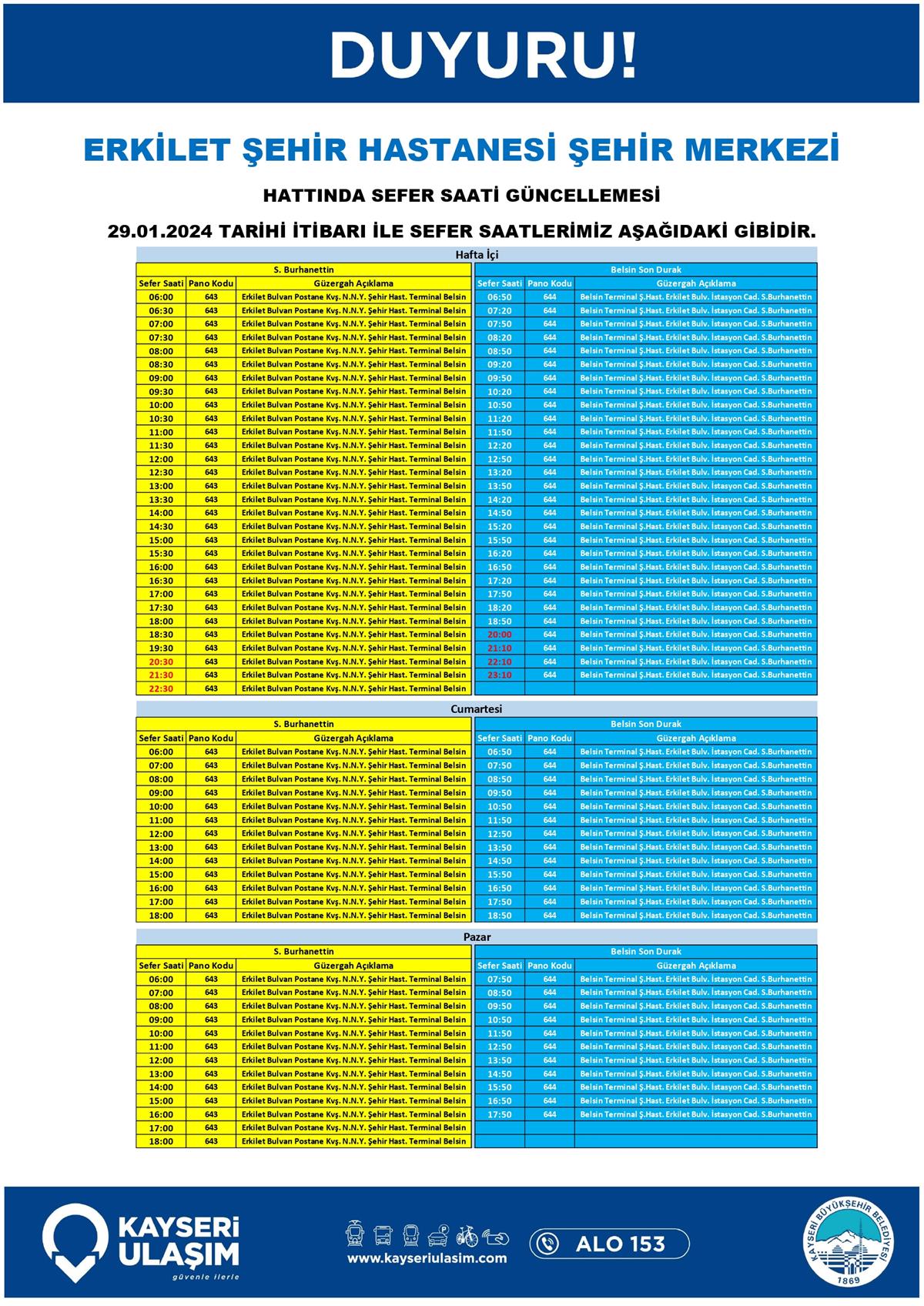 ERKİLET ŞEHİR HASTANESİ ŞEHİR MERKEZİ HATTINDA SEFER SAATİ GÜNCELLEMESİ