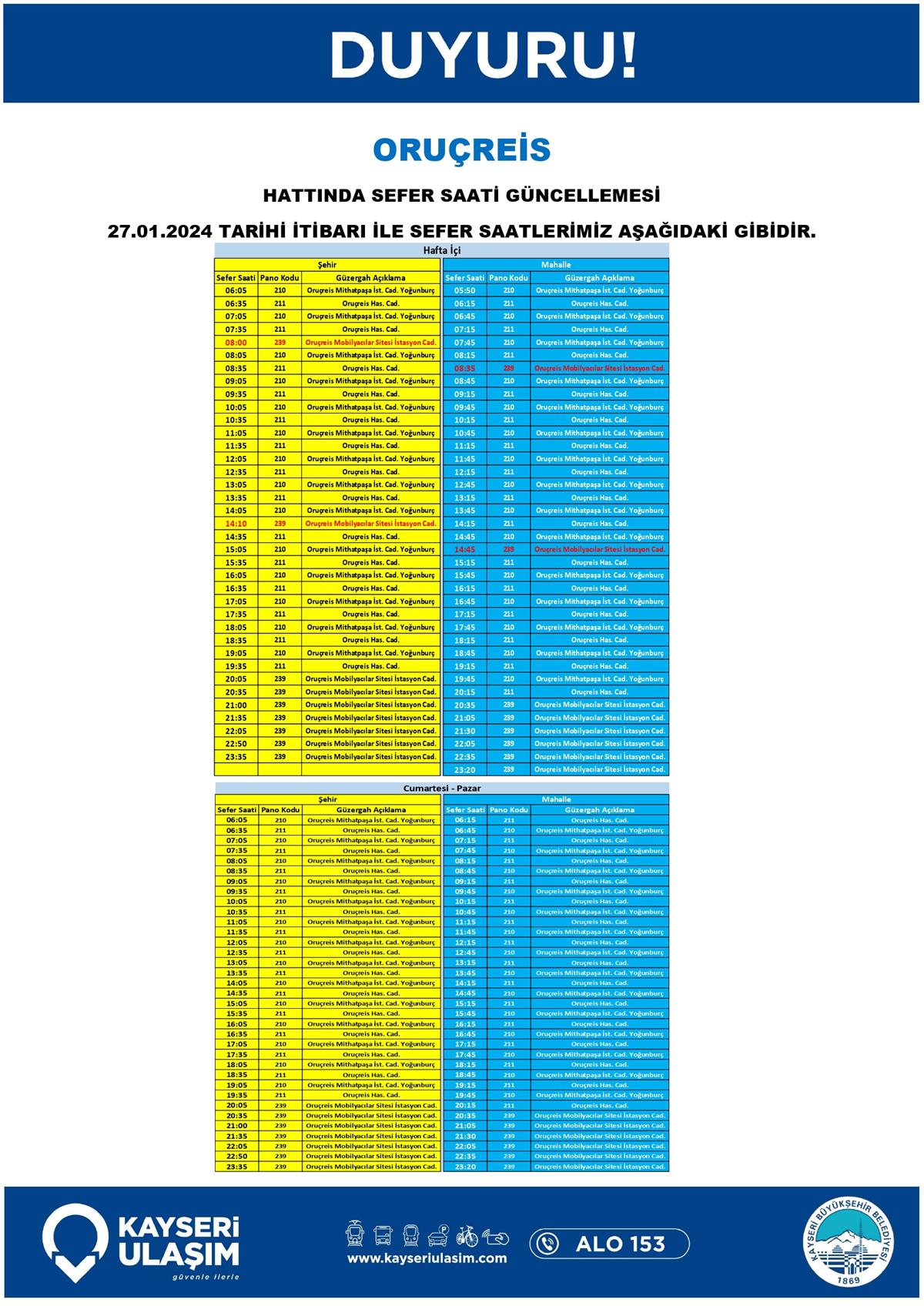 ORUÇREİS HATTINDA SEFER SAATİ GÜNCELLEMESİ