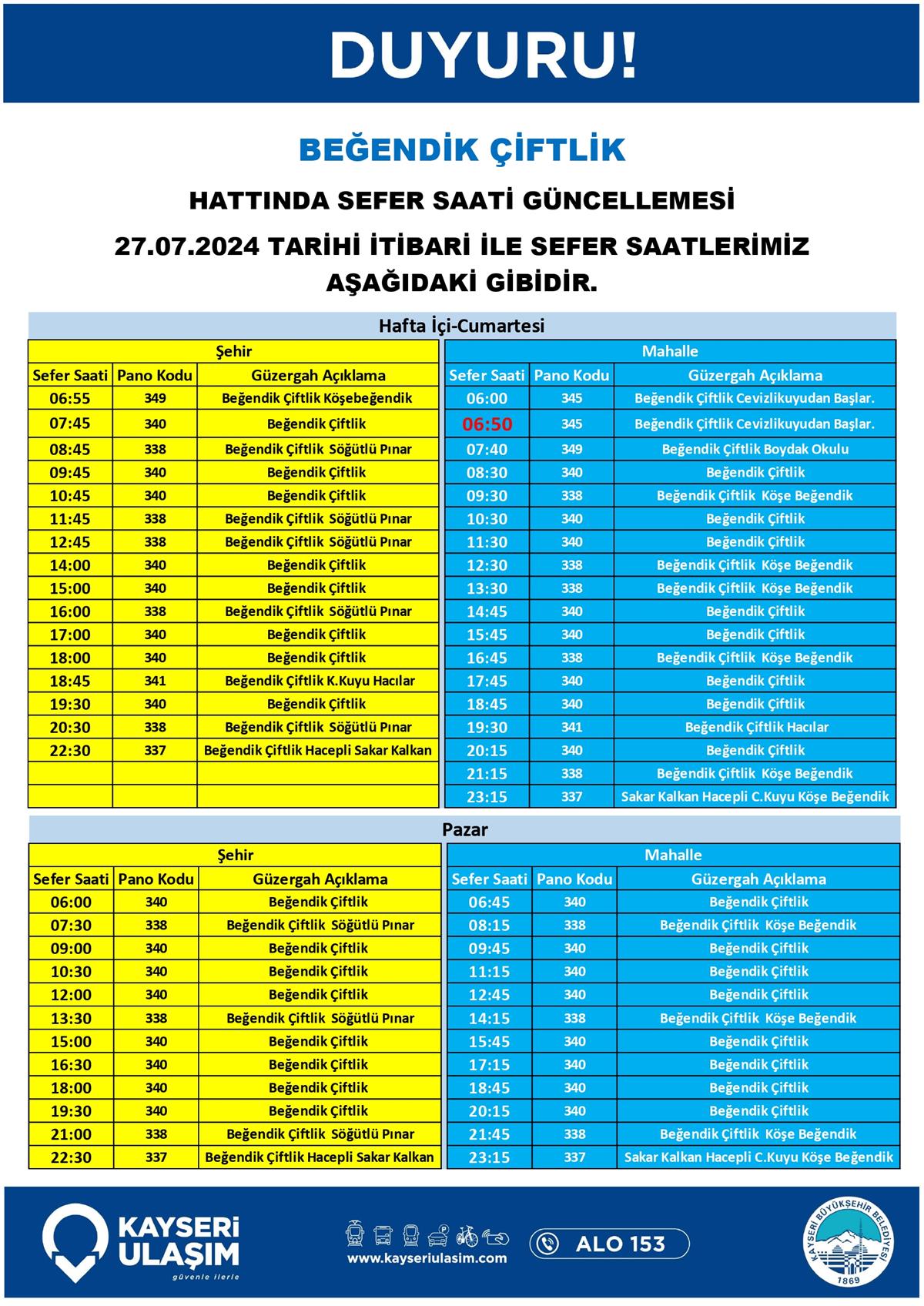 BEĞENDİK ÇİFTLİK HATTINDA SEFER SAATİ GÜNCELLEMESİ
