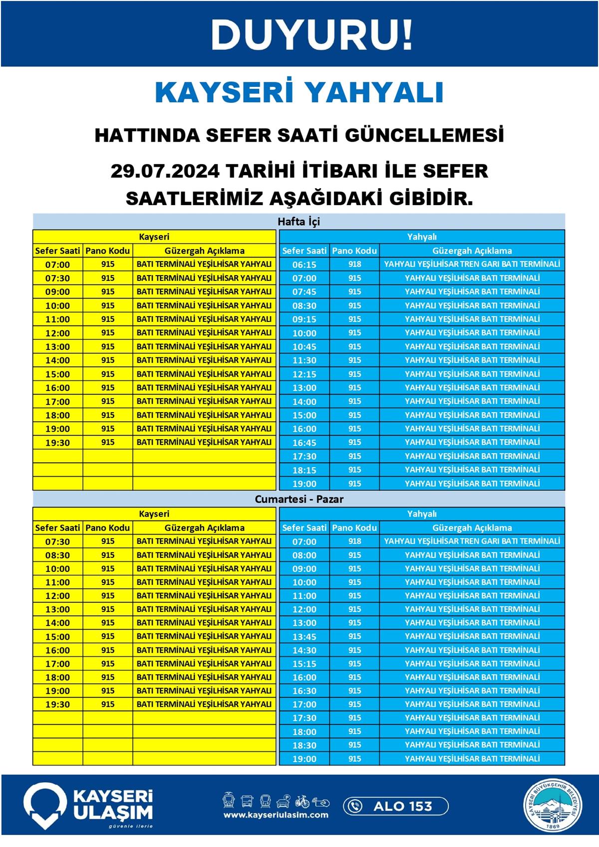 KAYSERİ YAHYALI HATTINDA SEFER SAATİ GÜNCELLEMESİ