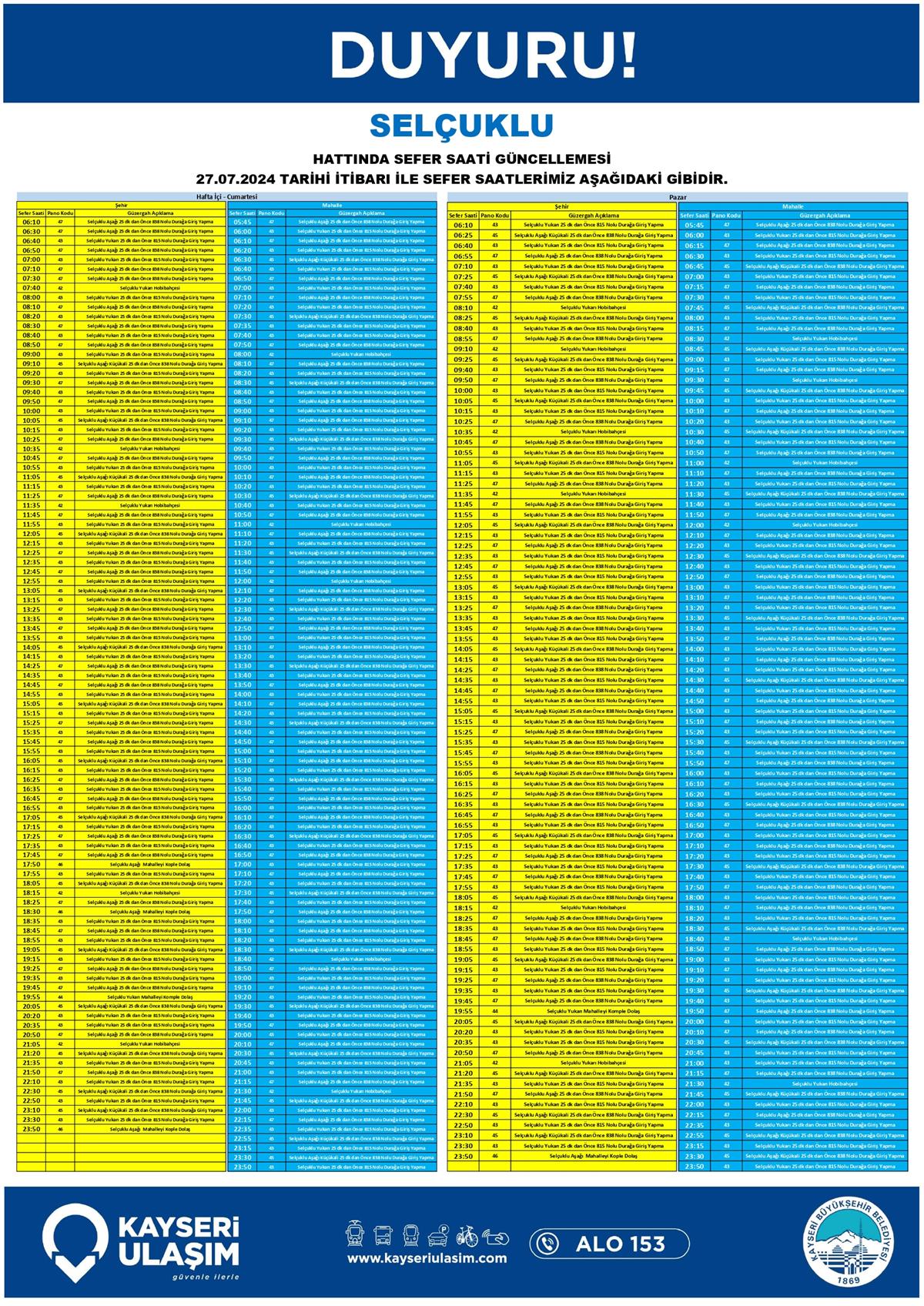 SELÇUKLU HATTINDA SEFER SAATİ GÜNCELLEMESİ