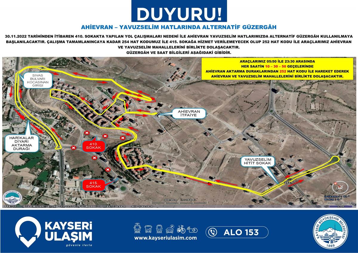 30.11.2022 TARİHİNDEN İTİBAREN 410. SOKAKTA YAPILAN YOL ÇALIŞMALARI NEDENİ İLE AHİEVRAN YAVUZSELİM HATLARIMIZDA ALTERNATİF GÜZERGAH KULLANILMAYA BAŞLANILACAKTIR. ÇALIŞMA TAMAMLANINCAYA KADAR 254 HAT KODUMUZ İLE 415. SOKAĞA HİZMET VERİLEMEYECEK OLUP 252 HAT KODU İLE ARAÇLARIMIZ AHİEVRAN VE YAVUZSELİM MAHALLELERİNİ BİRLİKTE DOLAŞACAKTIR. GÜZERGAH VE SAAT BİLGİLERİ AŞAĞIDAKİ GİBİDİR.