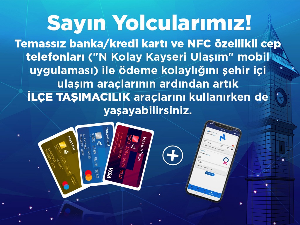 Kent içi ulaşım araçlarının ardından artık İLÇE TAŞIMACILIK araçlarında da temassız banka/kredi kartı ve NFC özellikli cep telefonları (N Kolay Kayseri Ulaşım Mobil Uygulaması) ile ödeme devreye alınmıştır.