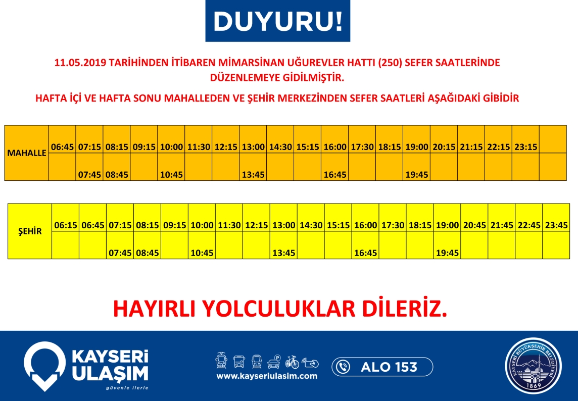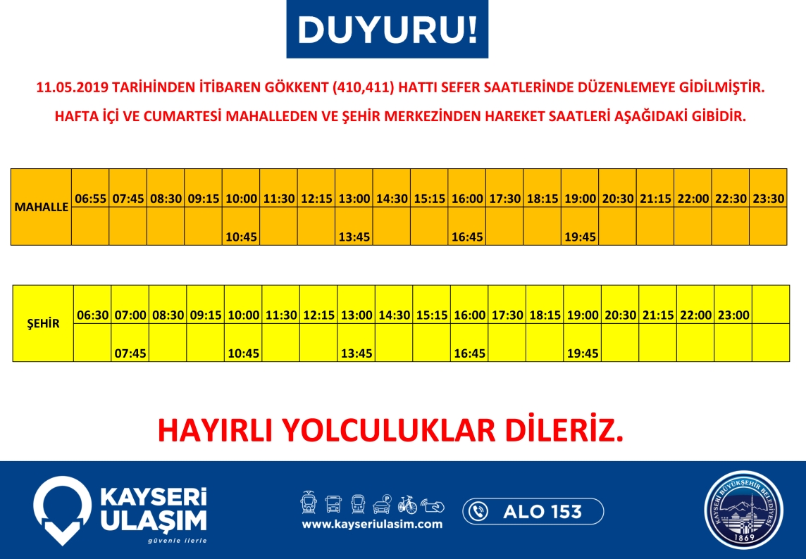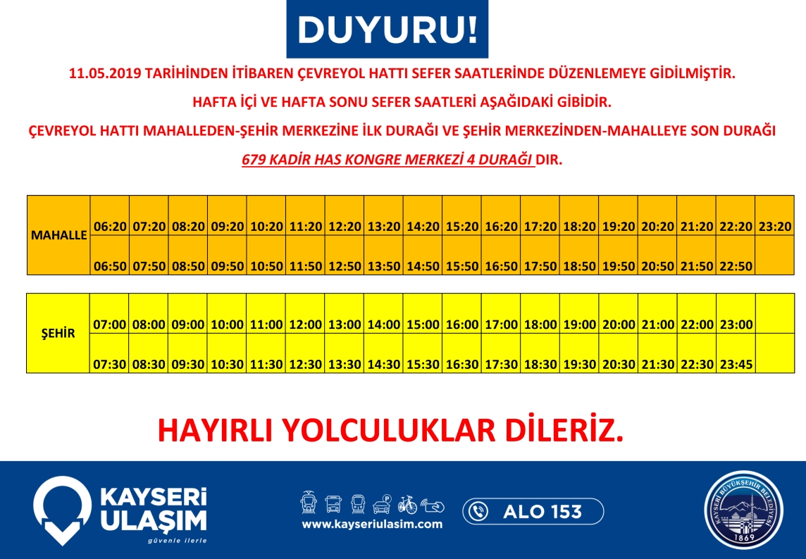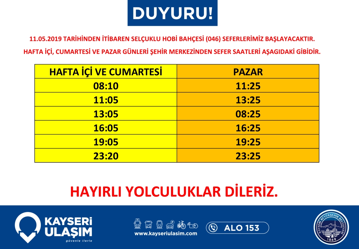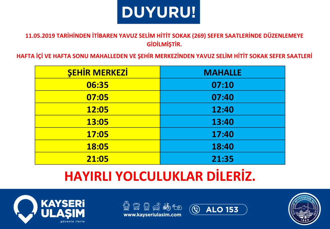11.05.2019 tarihinden itibaren;Yavuz Selim Hitit (269), Çevreyol, Gökkent (410,411), Mimarsinan Uğur Evler (250), Selçuklu Hobi Bahçesi (046) Hatlarında düzenlemeye gidilecektir. Detaylı bilgiye görsellerden ulaşabilirsiniz.