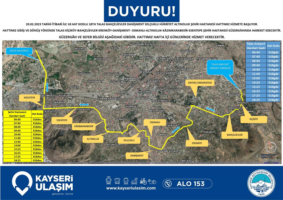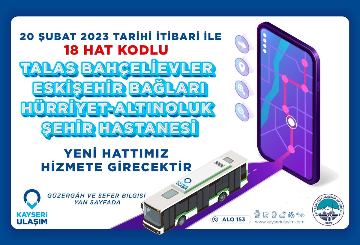 20 Şubat Pazartesi Günü itibariyle; Talas Bahçelievler-Eskişehir Bağları-Hürriyet-Altınoluk-Şehir Hastanesi hattımız hizmete açılıyor...