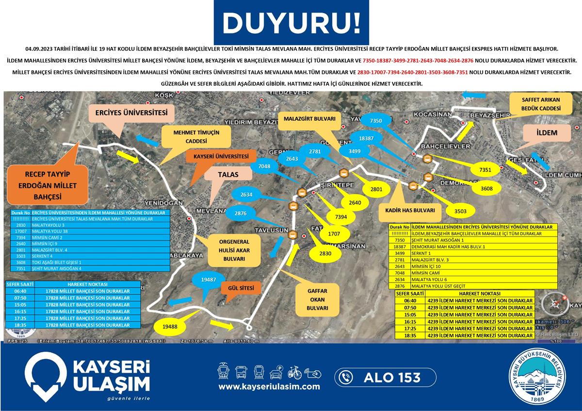 04.09.2023 TARİHİ İTİBARİ İLE 19 HAT KODLU İLDEM BEYAZŞEHİR BAHÇELİEVLER TOKİ MİMSİN TALAS MEVLANA MAH. ERCİYES ÜNİVERSİTESİ RECEP TAYYİP ERDOĞAN MİLLET BAHÇESİ EKSPRES HATTI HİZMETE BAŞLIYOR