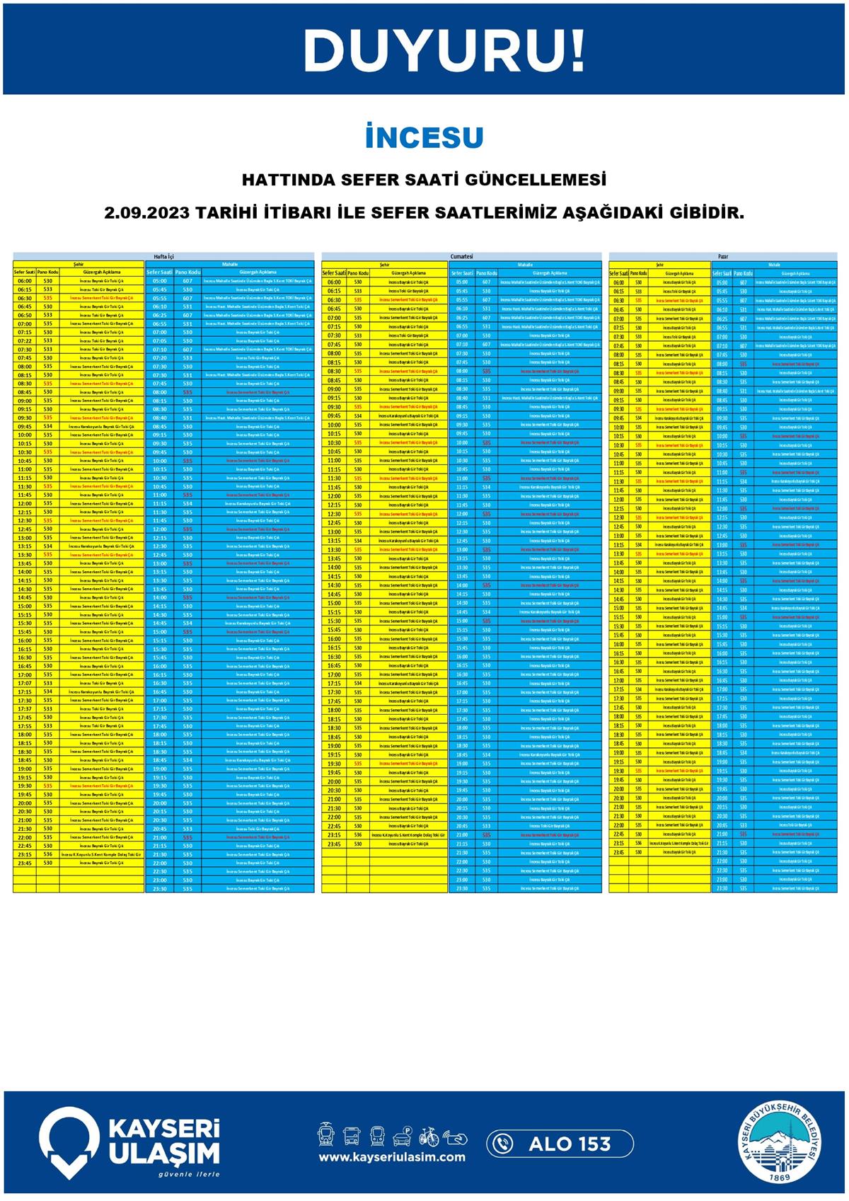 İNCESU HATTINDA SEFER SAATİ GÜNCELLEMESİ