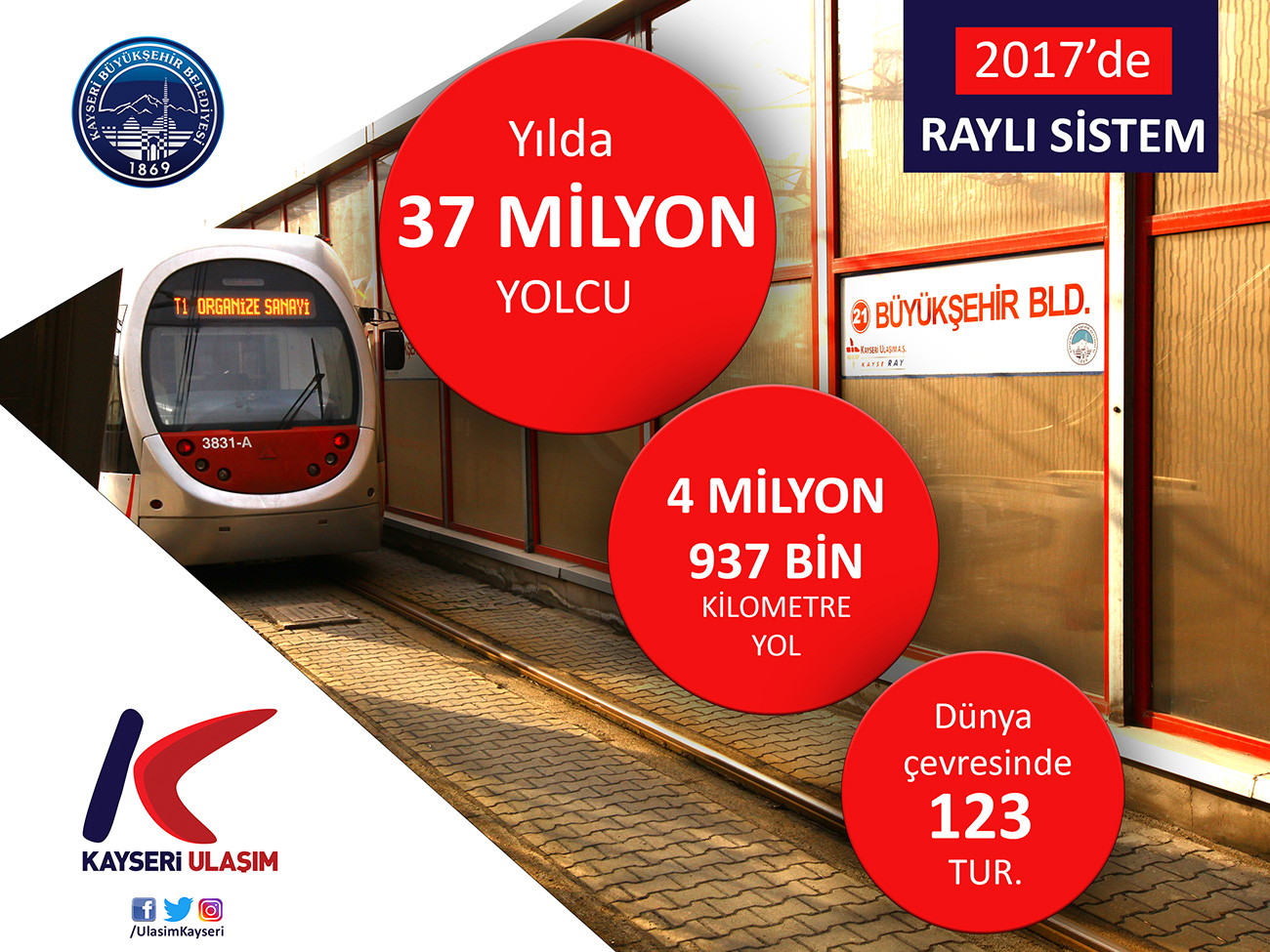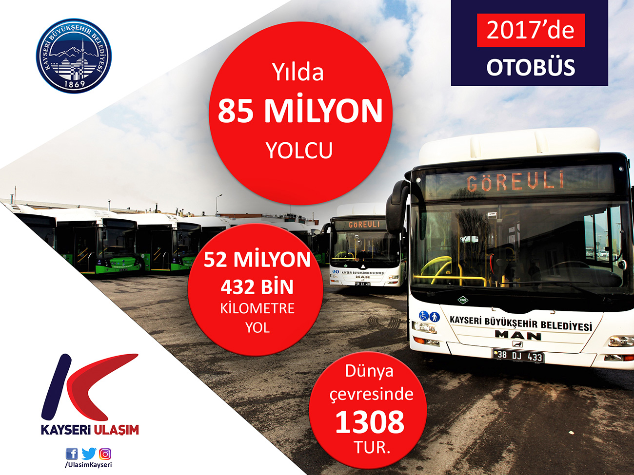 2017 yılının yolcu sayılarını değerlendiren Kayseri Ulaşım A.Ş Genel Müdürü Feyzullah Gündoğdu yolculukların 37 milyonunun raylı sistem araçları ile 85 milyonunun ise otobüsler ile yapıldığını söyledi. Gündoğdu; “Kayseri Ulaşım A.Ş. bünyesinde ve denetimindeki otobüsler 2017 yılında 52 milyon 420 bin kilometre, raylı sistem araçları ise 4 milyon 937 bin kilometre yol kat etti. Bu da otobüslerin dünyanın çevresinde tam 1308 tur, raylı sistem araçlarının ise 123 tur atmasına denk geliyor.” şeklinde konuştu.