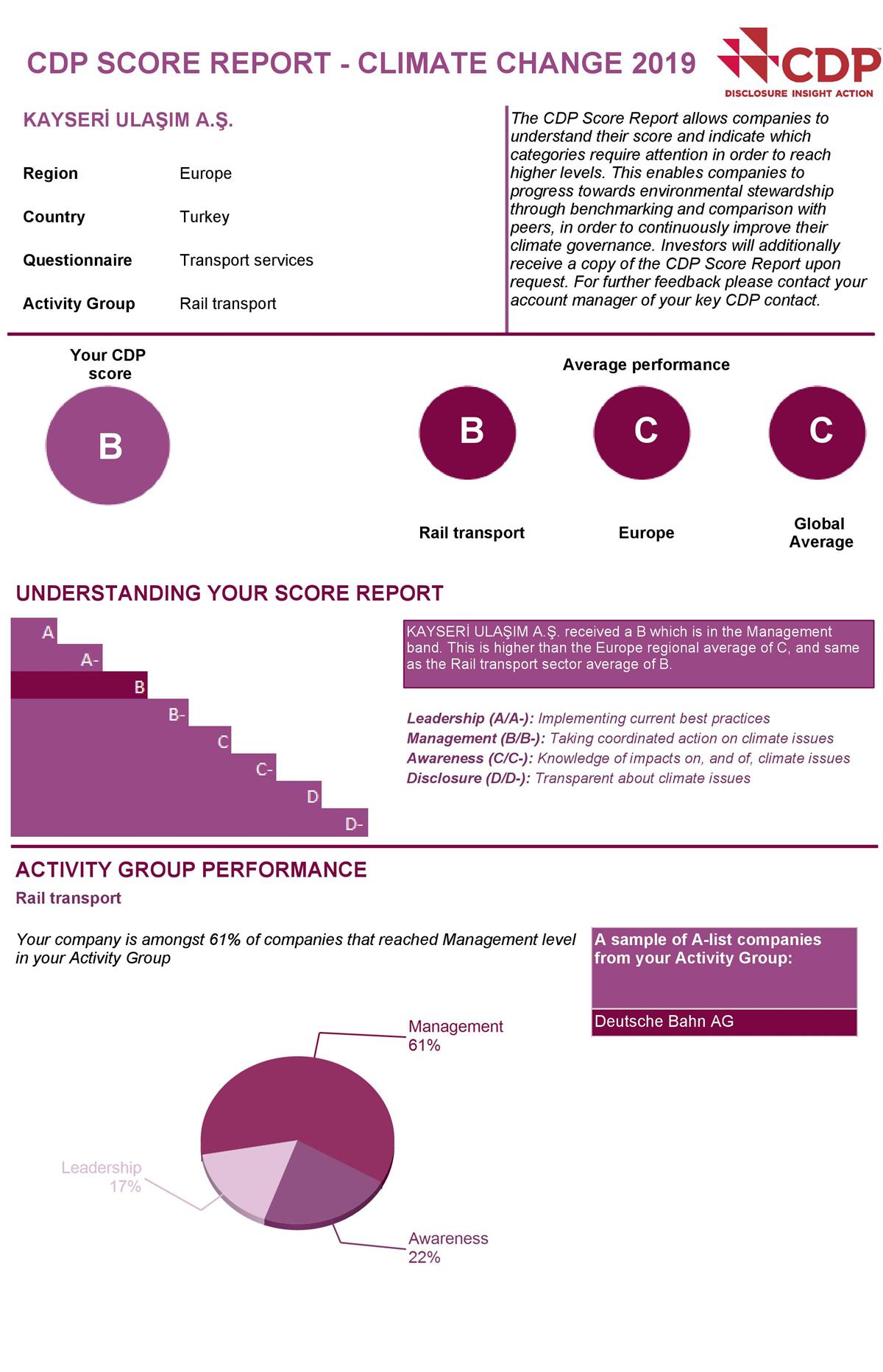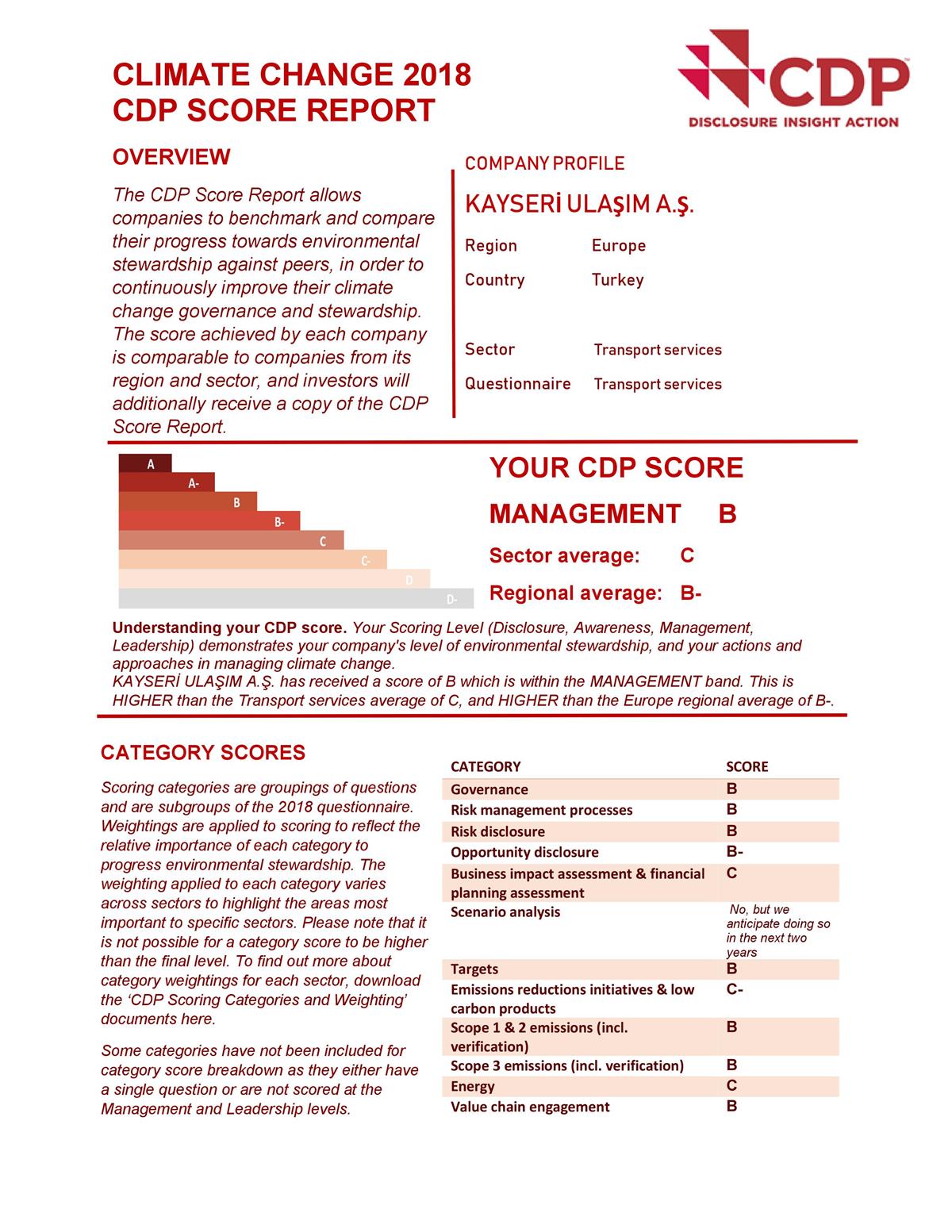 EN ISO 50001 Enerji Yönetim Sistemi ve TS ISO 14064 Sera Gazı Emisyonlarının Yönetimi kapsamında, enerji kaynaklarını daha verimli kullanmak, sera gazı emisyonlarını azaltmak, iklim değişikliği konusunda farkındalık oluşturmak için pek çok projeye imza atan ve birçok ilki başaran ulaşım şirketi olarak karbon emisyonları konusunda dünyanın en önemli inisiyatiflerinden Karbon Saydamlık Projesine (CDP) 4 yıldır katılım sağlamaktayız. Bu kapsamda yaptığımız çalışmalar ile bu yılda başarı çizgimizi koruduk ve “B (management)” notu aldık.