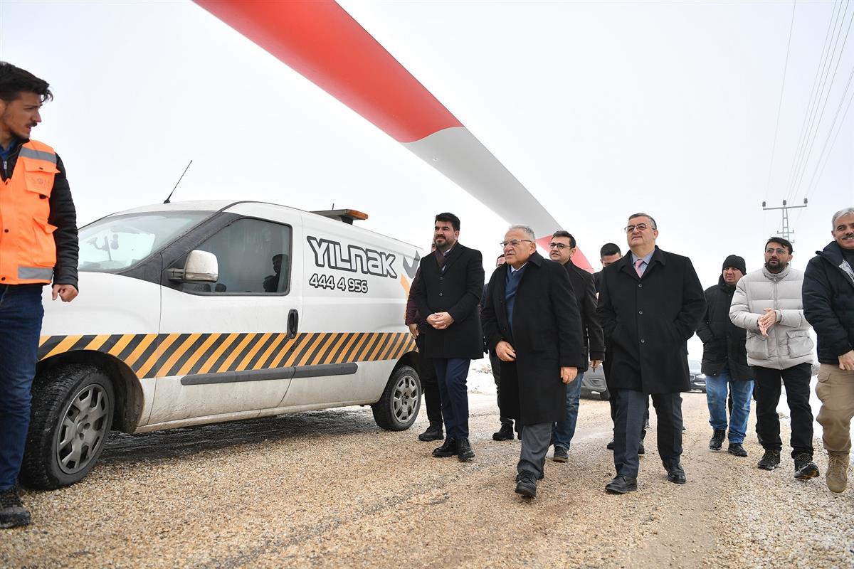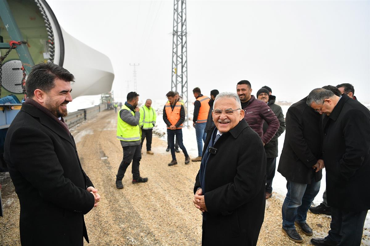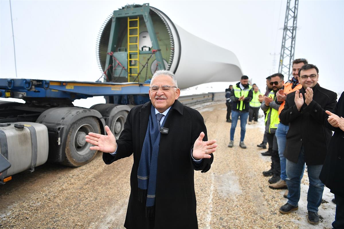 Türkiye’nin toplu ulaşım sektöründeki ilk Rüzgâr Enerji Santrali için türbinlerin dev parçalarından oluşan 80 araçlık sevkiyat, İzmir Alsancak Limanı’ndan Kayseri’ye doğru yola çıkarken, türbin parçaları peyderpey kente ulaşıyor. Büyükşehir Belediye Başkanı Dr. Memduh Büyükkılıç, projenin gerçekleştirildiği İncesu Fırınönü mevkiinde tırlarla taşınan türbinlere ait kanatlara yönelik incelemelerde bulundu.