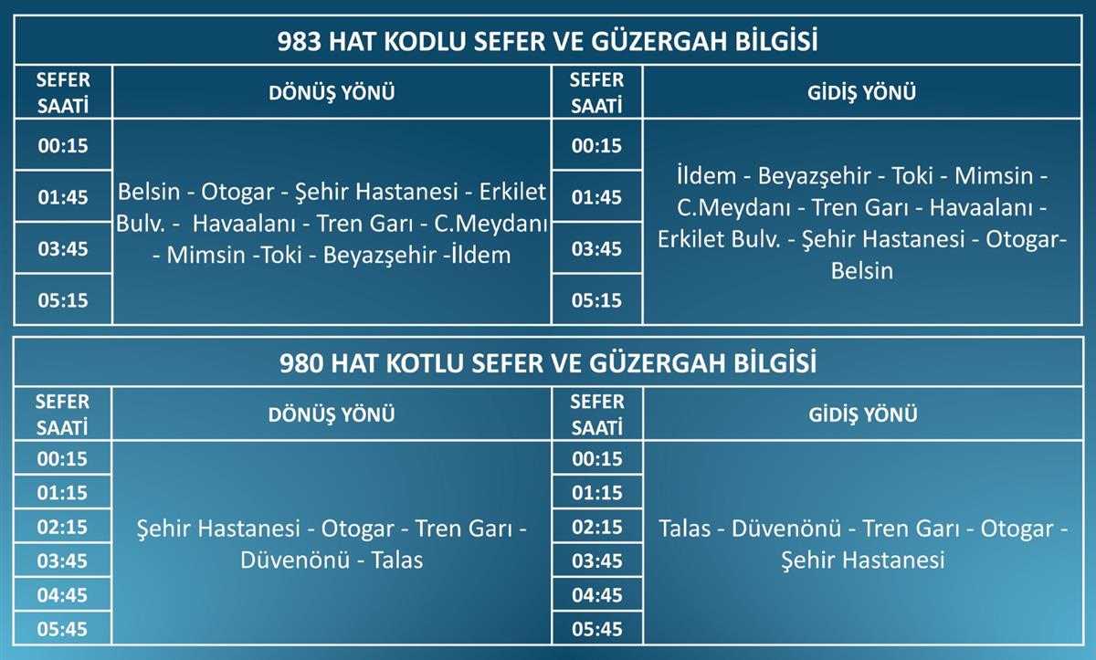 Başkan Büyükkılıç ayrıca, 980 hat kodlu sefer ve güzergâh kapsamında 00.15, 01.45, 02.15, 03.45, 04.45 ve 05.45 saatlerinde gidiş ve dönüş yolu olarak Şehir Hastanesi, Otogar, Tren Garı, Düvenönü ve Talas’ın belirlendiğini söyledi.