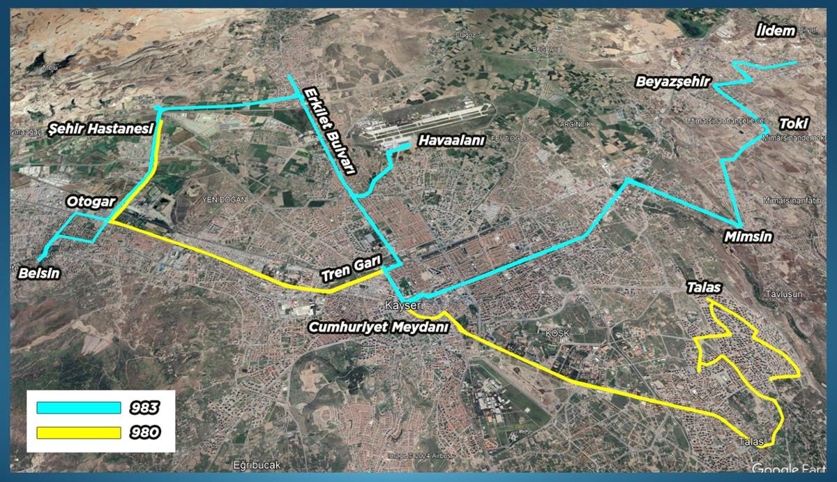 ‘Kayseri’de gece seferleri ile 24 saat kesintisiz ulaşım dönemi 8 Haziran’da başlıyor’ diyen Büyükkılıç, 983 hat kodlu sefer ve güzergâh kapsamında 00.15, 01.45, 03.45 ve 05.15 saatlerinde gidiş ve dönüş yolu olarak Belsin, Otogar, Şehir Hastanesi, Erkilet Bulvarı, Havaalanı, Tren Garı, Cumhuriyet Meydanı, Mimsin, TOKİ, Beyazşehir ve İldem’in belirlendiğini ifade etti.