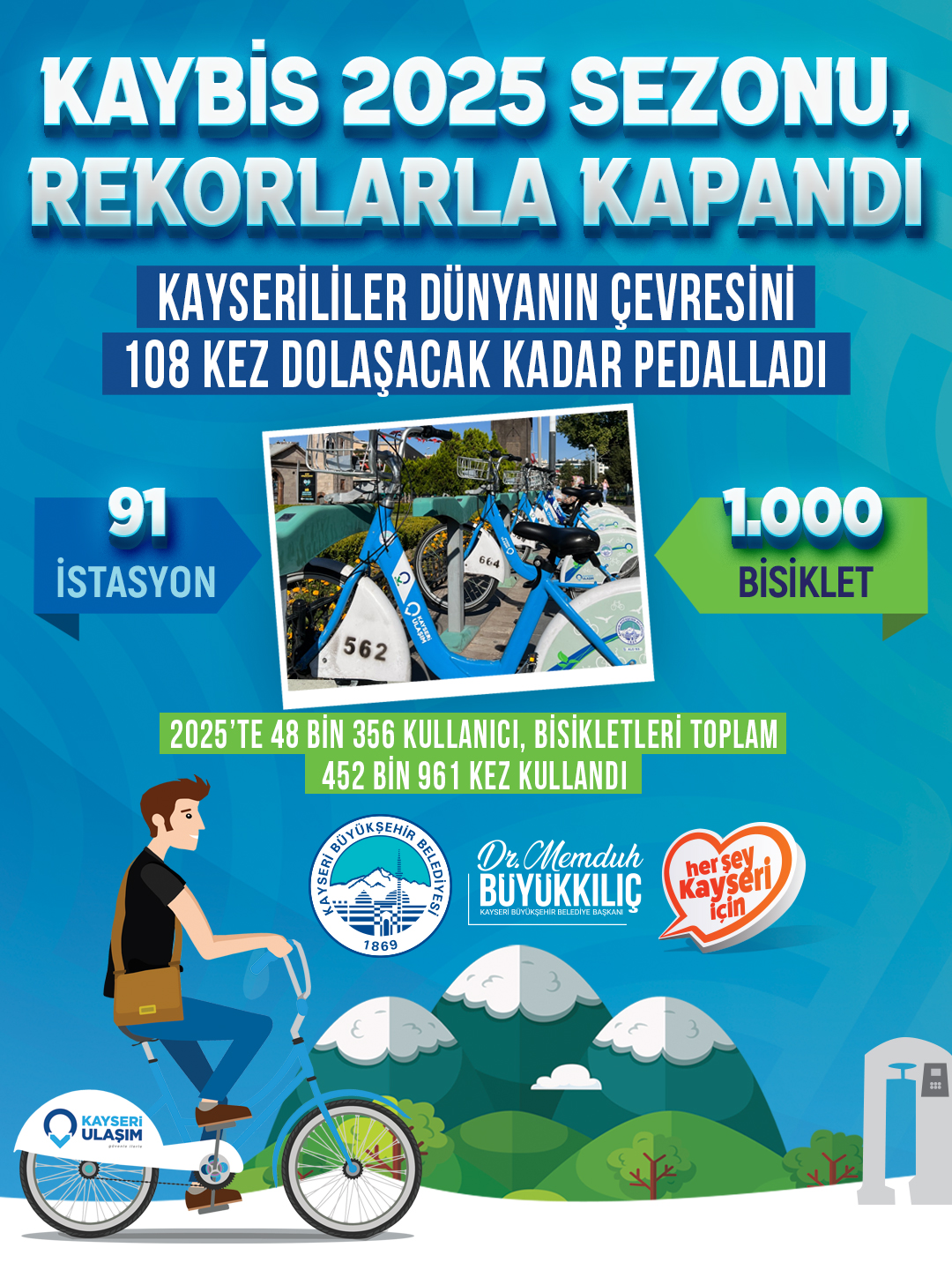 2025 yılı boyunca 48 bin 356 kullanıcı, bisikletleri toplam 452 bin 961 kez kullandı. Yıl içinde kaydedilen toplam mesafe ise 4 milyon 321 bin kilometreye ulaştı. Bu mesafe, Kaybis ile dünyanın etrafının 108 kez turlanması anlamına geliyor.