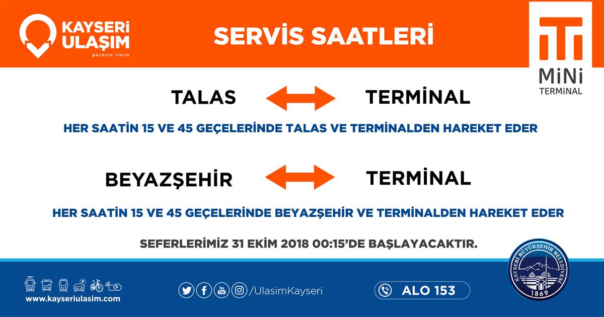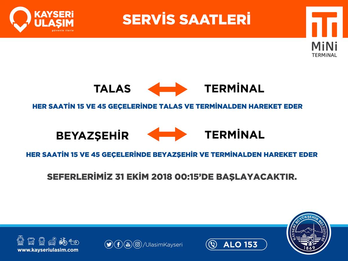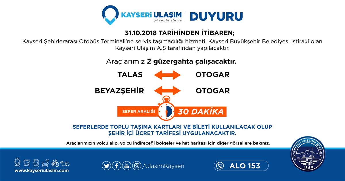 Büyükşehir Belediyesi, daha önce şehirlerarası otobüs firmaları tarafından yapılan ve kısa süre önce bu firmaların aldığı kararla kaldırılan servis taşımacılığını üstlendi. 31 Ekim tarihi itibarıyla bu hizmeti üstlenerek vatandaşların bu alandaki mağduriyetini gideren Büyükşehir Belediyesi, Terminal için Talas ve Beyazşehir’den başlayan iki ayrı ring hattı oluşturdu.