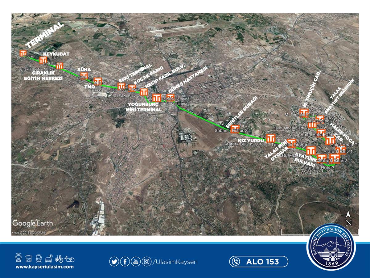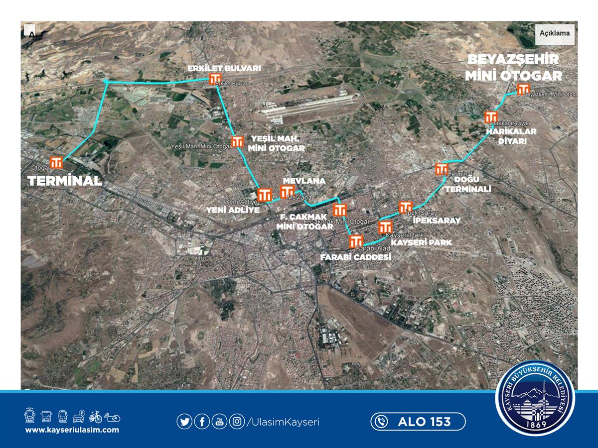 Beyazşehir-Otogar Servis güzergahı Beyazşehir Mini Terminal önünden başlayacak ve Anadolu Harikalar Diyarı, Doğu Terminali, İpek Saray, Kayseri Park, Farabi Caddesi, Fevzi Çakmak Mini Terminali, Mevlana, Yeni Adliye, Yeni Mahalle Mini Terminali ve Erkilet Bulvarı güzergahında devam edecek.