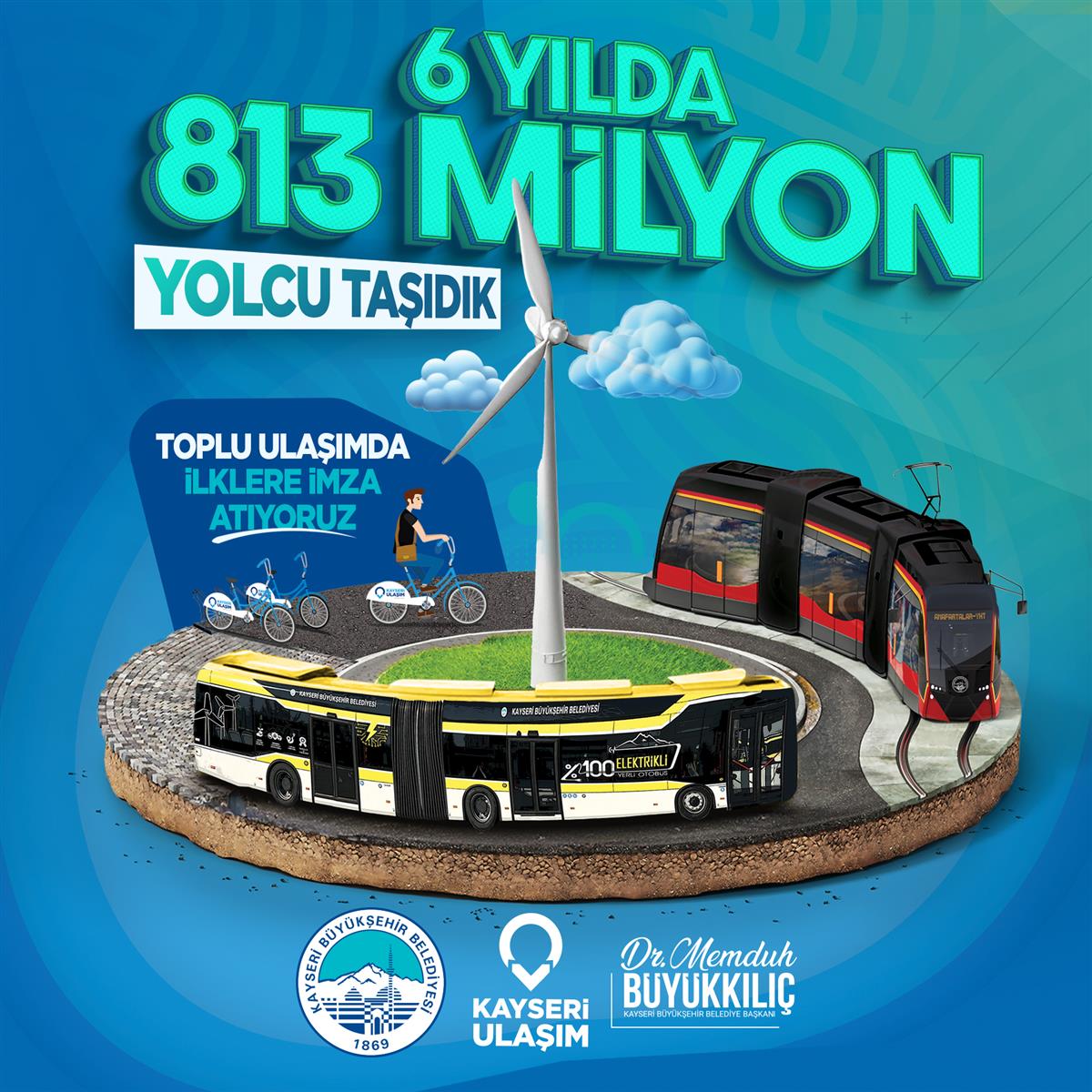 Kayseri Büyükşehir Belediyesi Ulaşım A.Ş., Başkan Dr. Memduh Büyükkılıç’ın eser ve hizmet belediyeciliğinde insanı merkeze alan vizyonu doğrultusunda 2019 yılından bu yana 6 yıllık süreçte kentin toplu ulaşım ağına yönelik devasa yatırımlara imza attı ve hizmet kalitesini arttırdığı toplu ulaşım sistemi ile 6 yılda 813 milyon yolcuya hizmet verdi.