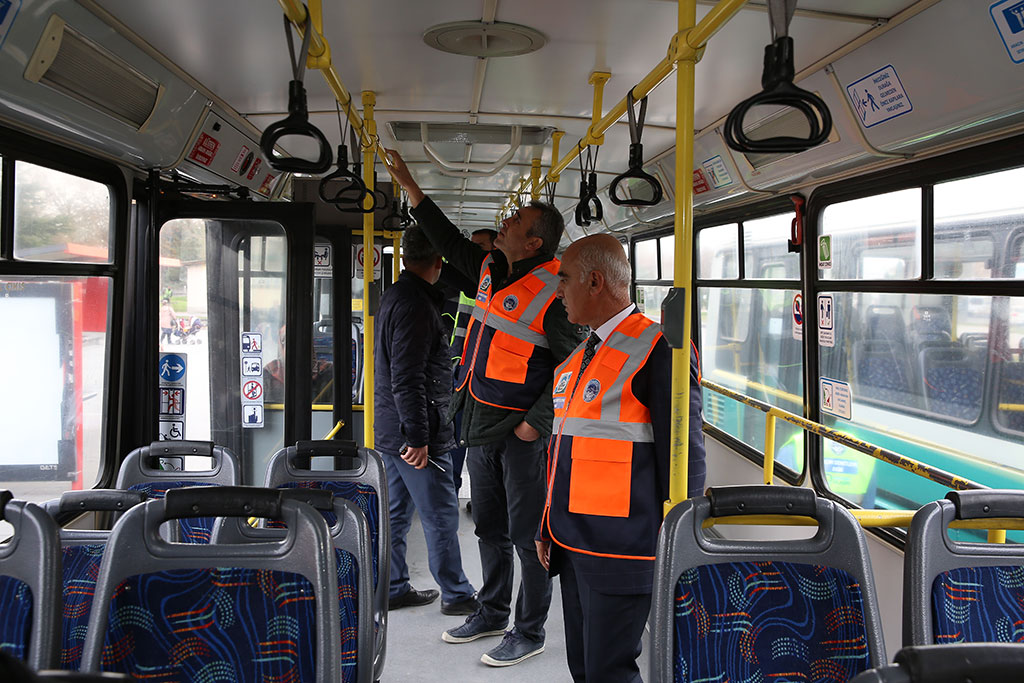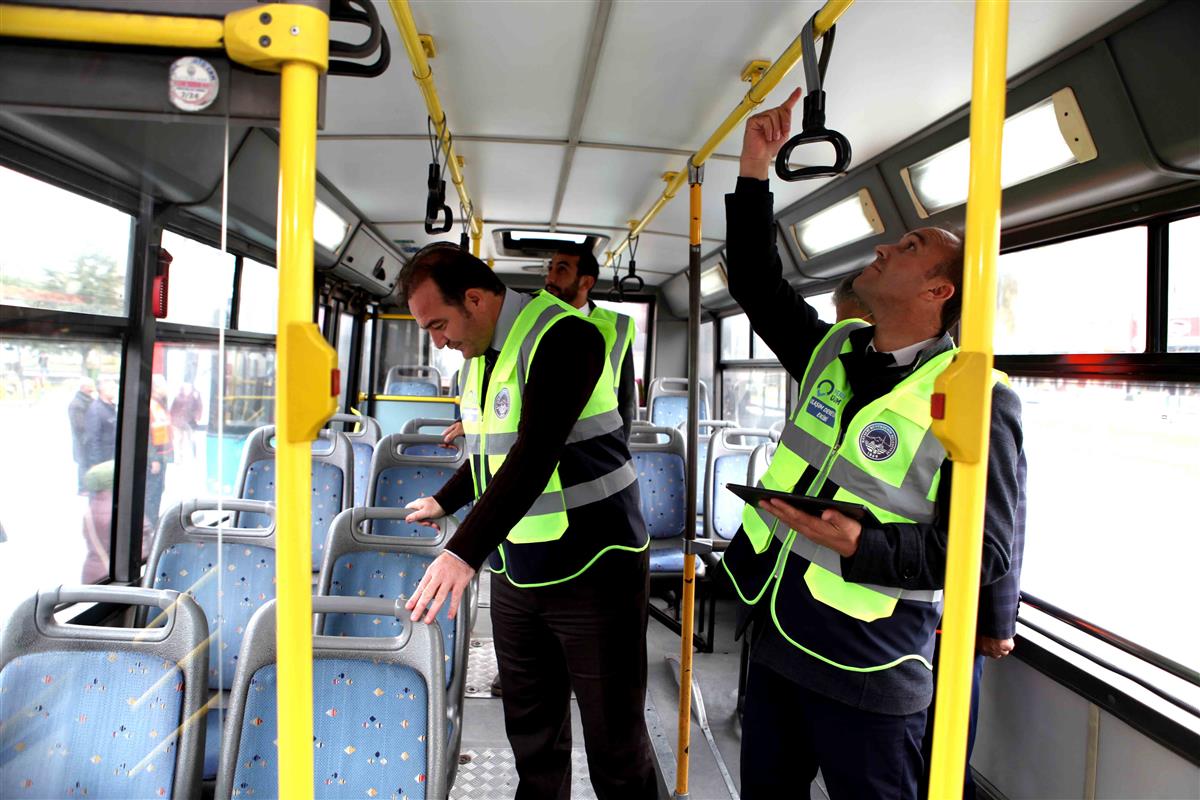 Seyit Burhaneddin Durağı’nda görevli Ulaşım Denetleme Ekibi denetimlerine otobüslerin dış görünümü ile başladı ve tüm otobüslerin içi ile şoförlerin kılık kıyafeti denetime tabi tutuldu. Denetimlerde, otobüslerdeki yolcuların elle temas ettikleri yerlerin temizliği detaylı bir şekilde kontrol edildi. Denetimler sırasında görülen tüm eksikliklerle ilgili rapor oluşturularak şoförler uyarıldı.