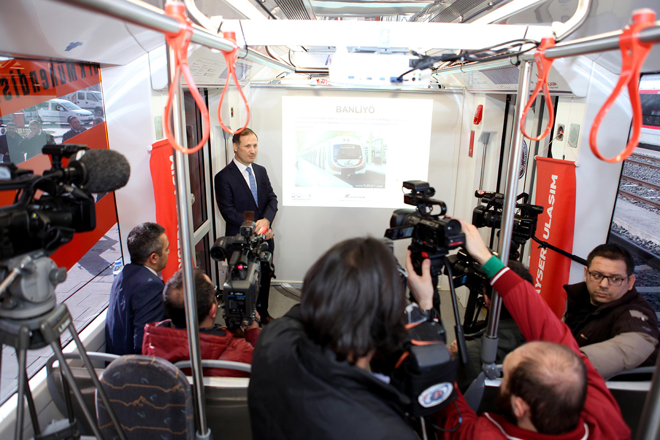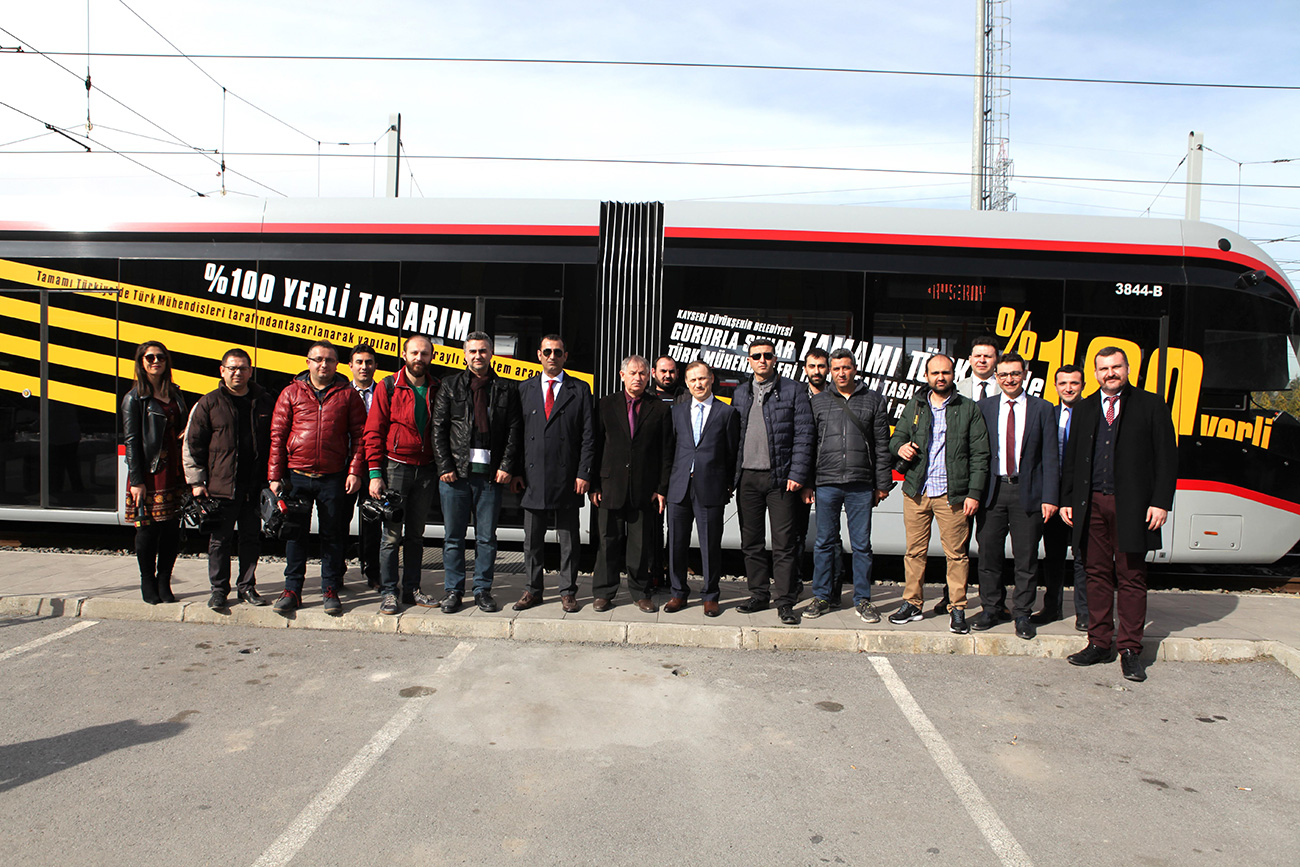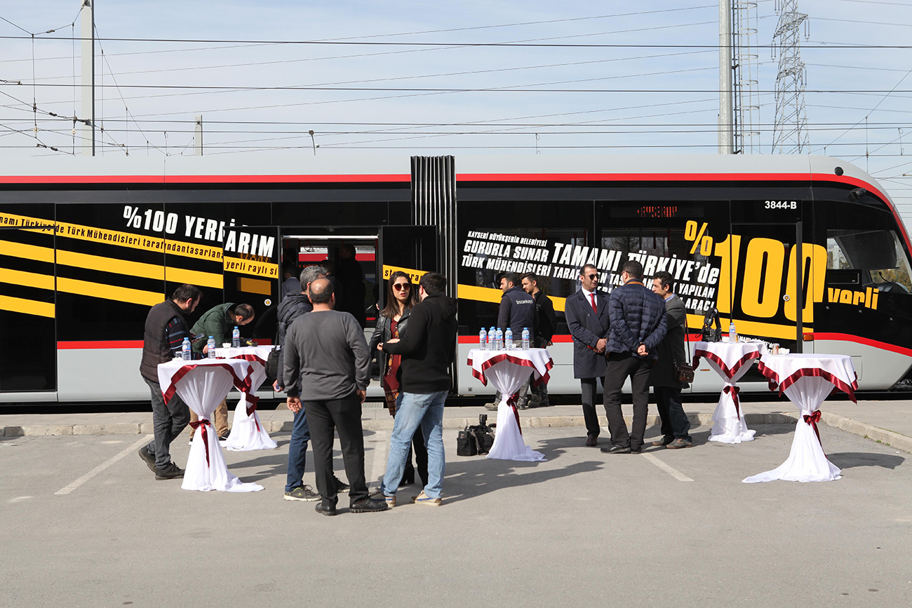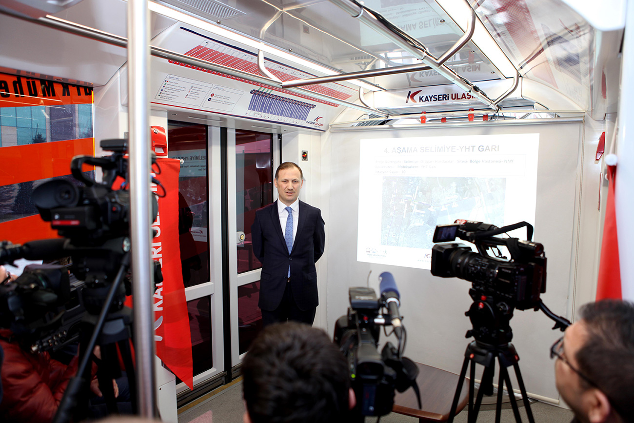 Ulaşım A.Ş.’nin, kurulduğu günden itibaren kurumsallaşmaya önem verdiğini belirten Gündoğdu, ISO 9001 Kalite Yönetim Sistemi ile ISO 14001, ISO 18001, ISO 10002, ISO 14064, ISO 50001 standartları aldıklarını ve etkin olarak kullandıklarını söyledi. 34 km hat uzunluğuna ve 55 istasyona ulaşan raylı sistemde 68 araçla hizmet verildiğini ifade eden Gündoğdu, bu araçlardan 30’unun yerli üretim olduğunu vurguladı. Gündoğdu, “2014 yılında Kayseri Büyükşehir Belediye Başkanlığını yürüten Sayın Mehmet Özhaseki’nin önderliğinde ve yönlendirmesiyle yerli üretimi teşvik edecek ama yabancı firmaların ihaleye girmesini engellemeyecek şekilde teknik şartnameler hazırlanmıştır. İhale karar süreçlerinde, Kalite, performans, işletme ve bakım giderleri gibi fiyat dışı unsurların değerlendirilmesinin yasal olarak mümkün olmasından dolayı, bu unsurları kapsayacak şekilde hazırlanmış olan ihale dokümanları neticesinde hem fiyat avantajı hem de teknik olarak üstünlük gösteren yerli firma ihaleyi kazanmıştır. Bir önceki araç alım ihalesi fiyatına göre 900 bin Euro daha avantajlı olarak alınan yeni raylı sistem araçları ile birlikte 30 araçlık filo için 27 milyon Euro daha az ödeme yapılmıştır. Kayseri Büyükşehir Belediyesinin yerli araç temin etmesi ile birlikte yerli üreticiler daha etkin hale gelmiş ve farklı şehirler de yerli araç alımı yönünde tercihlerini kullanmışlardır. Sayın Mustafa Çelik Başkan göreve geldikten sonra projeyi sahiplenmiş, onun da desteği ile birlikte yerli raylı sistem araçları, seri üretimleri tamamlanarak 2016 yılı içinde hizmete alınmaya başlanmıştır. Yerli raylı sistem araçlarımız muadillerine göre bakım ve işletme giderlerinde daha avantajlı ve daha yüksek performansa sahiptir. Yeni araçlarımız tasarım olarak yüzde yüz yerli, donanım anlamında yüzde 60 oranında yerlilik payına sahiptir. Üretimi Ankara-Sincan’ da yapılmıştır.”