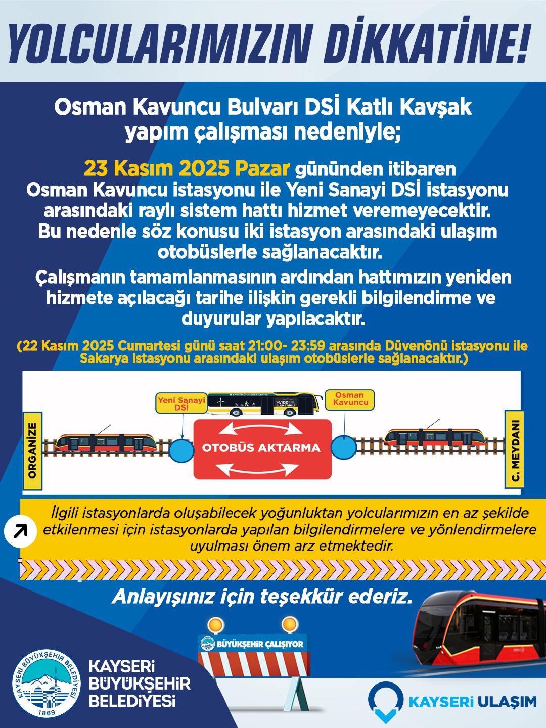 23 Kasım 2025 Pazar gününden itibaren Osman Kavuncu istasyonu ile Yeni Sanayi DSi