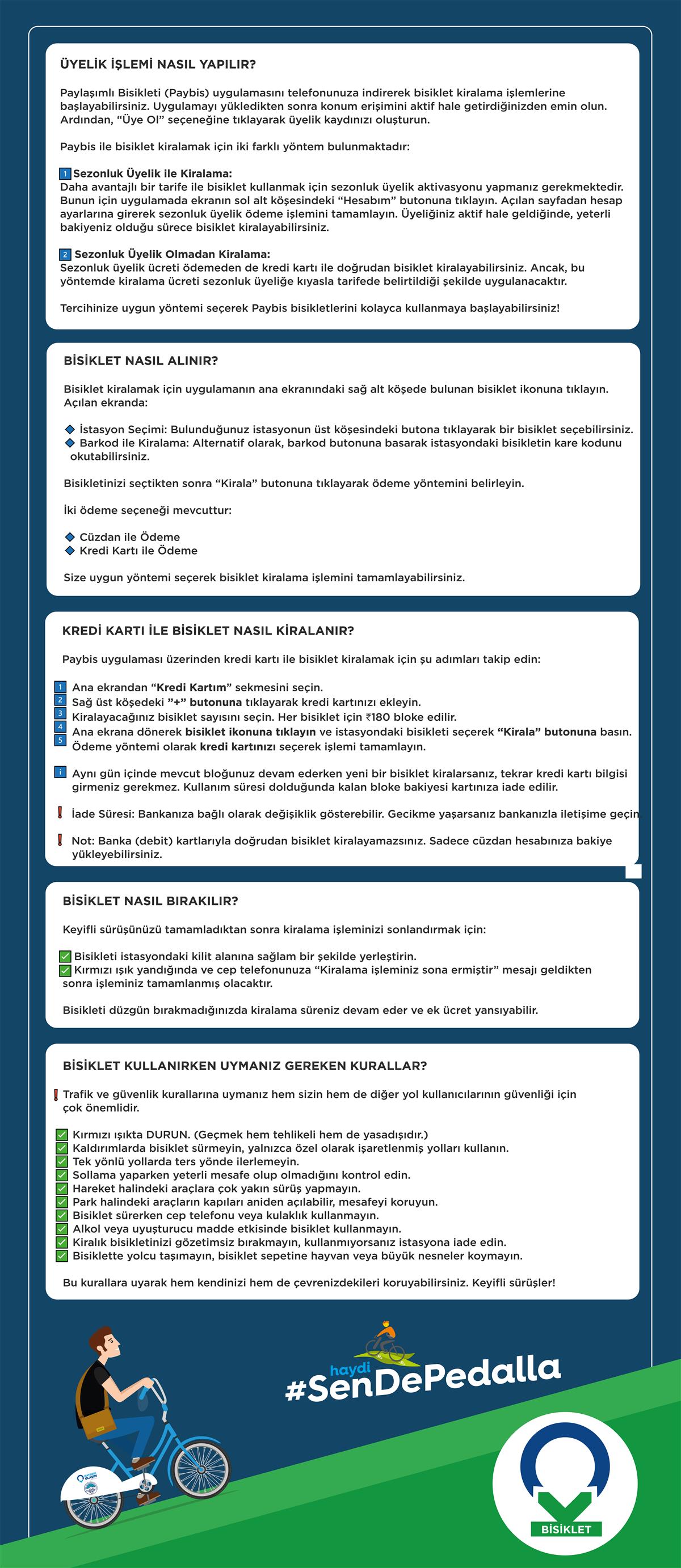 NOT: Kredi kartı ile bisiklet alımlarınızda kredi kartınızdan depozito alınmakta ve depozito ücreti gün sonunda kredi kartınıza tekrardan iade edilmektedir. Bu iade süresi bankalara göre değişiklik gösterebilmektedir. İade sürenizin uzaması durumunda lütfen bankanız ile görüşünüz.