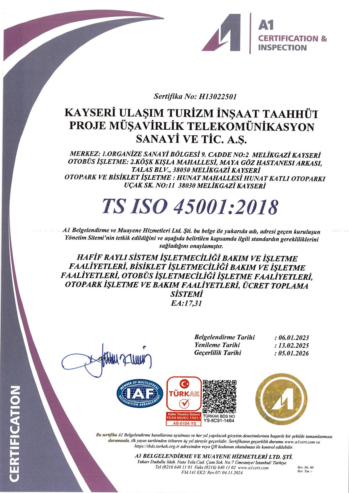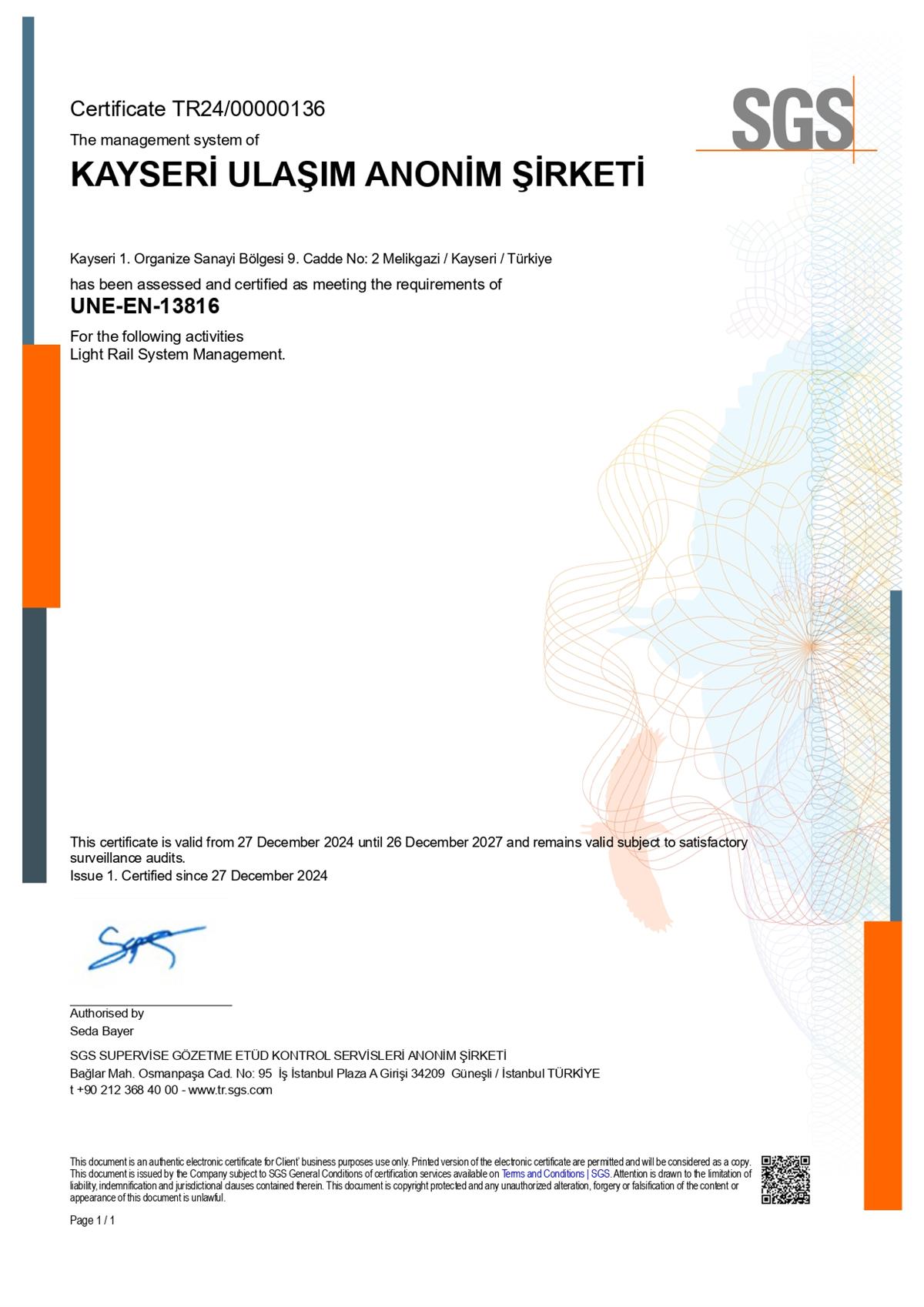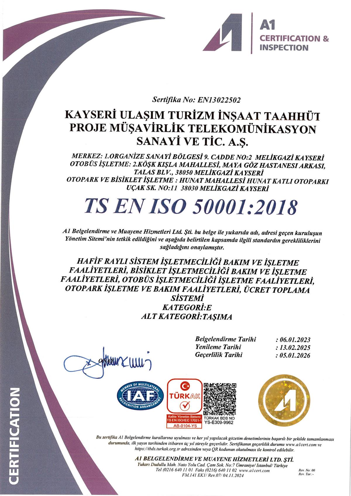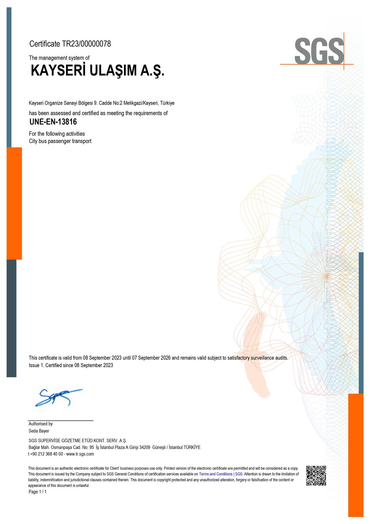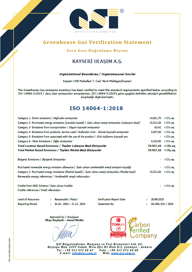 Kayseri Ulaşım A.Ş faaliyetlerini uluslararası standartlara uygun bir şekilde yürütmektedir.